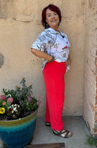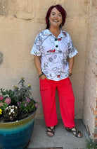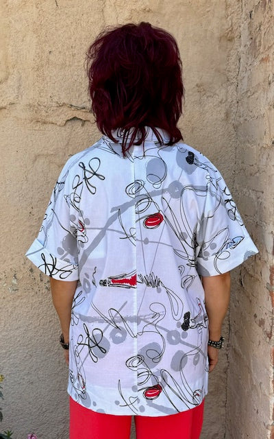 Be bold and playful in the Aliesha Button Down Top by Ever Sassy! Featuring a fun graffiti print, cuffed sleeves, and 4 large functional buttons, this top is both stylish and functional. The side slits with hi-low styling and relaxed, generous fit make it the perfect choice for a comfortable yet trendy look. Plus, the stretchy fabric ensures a comfortable fit all day long.