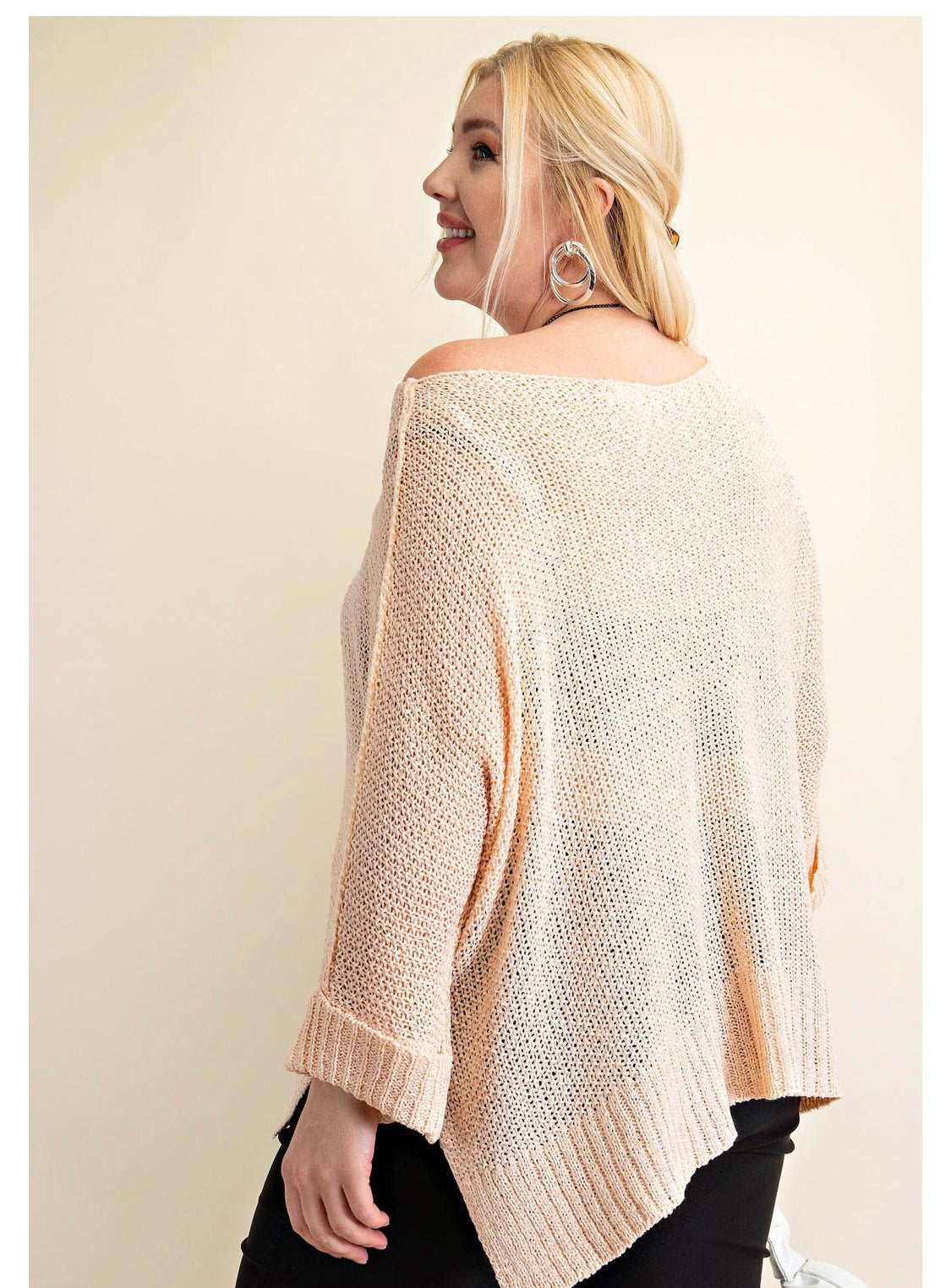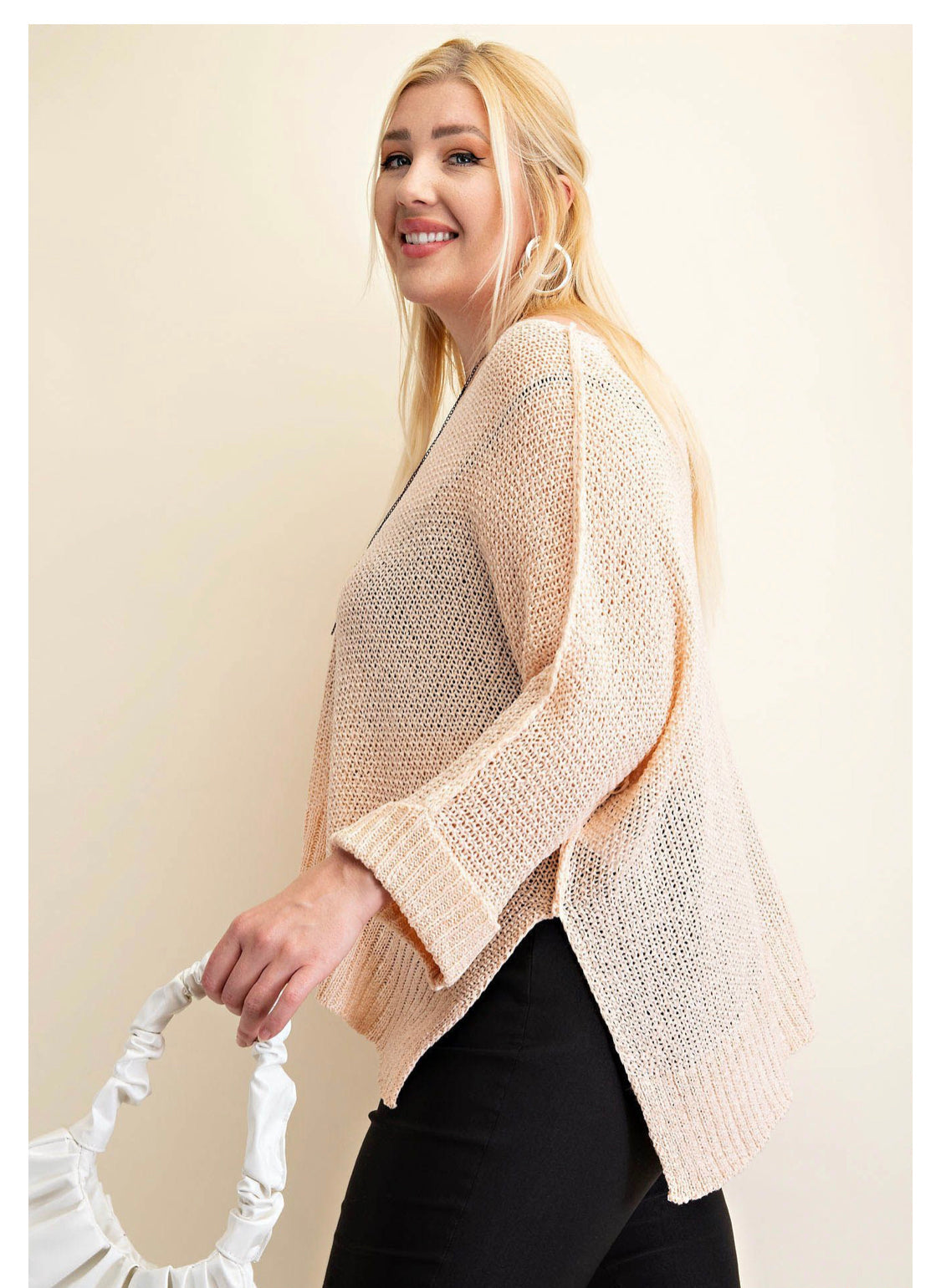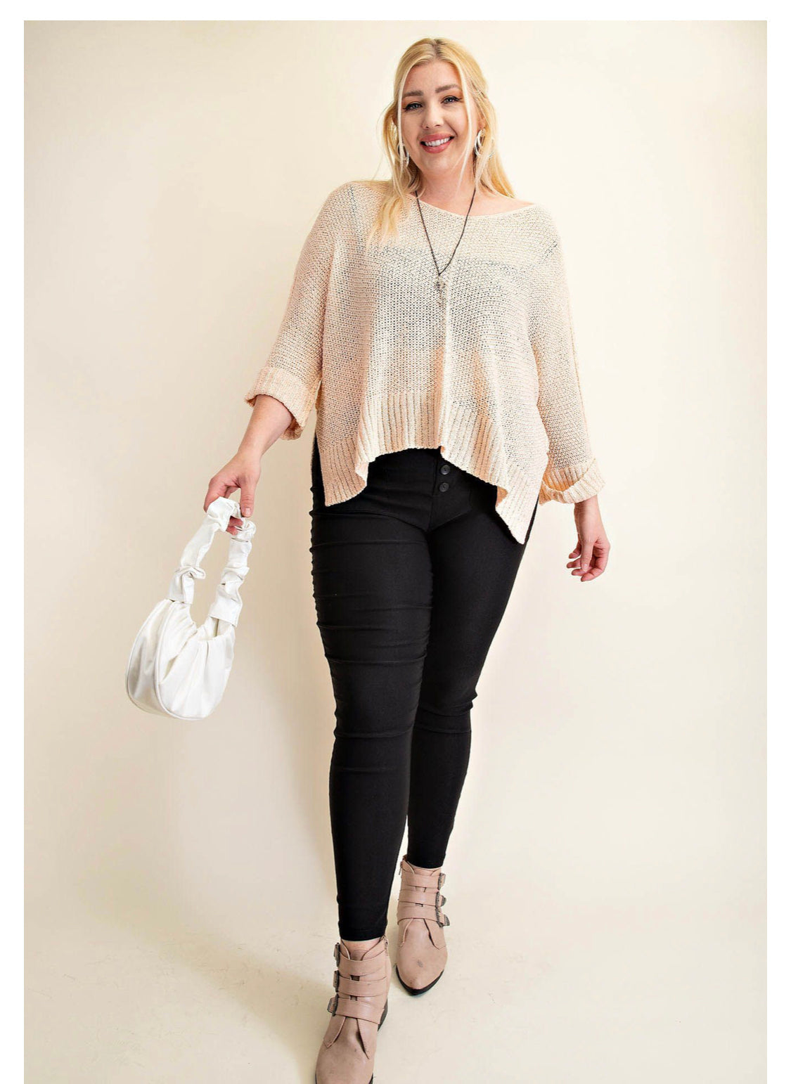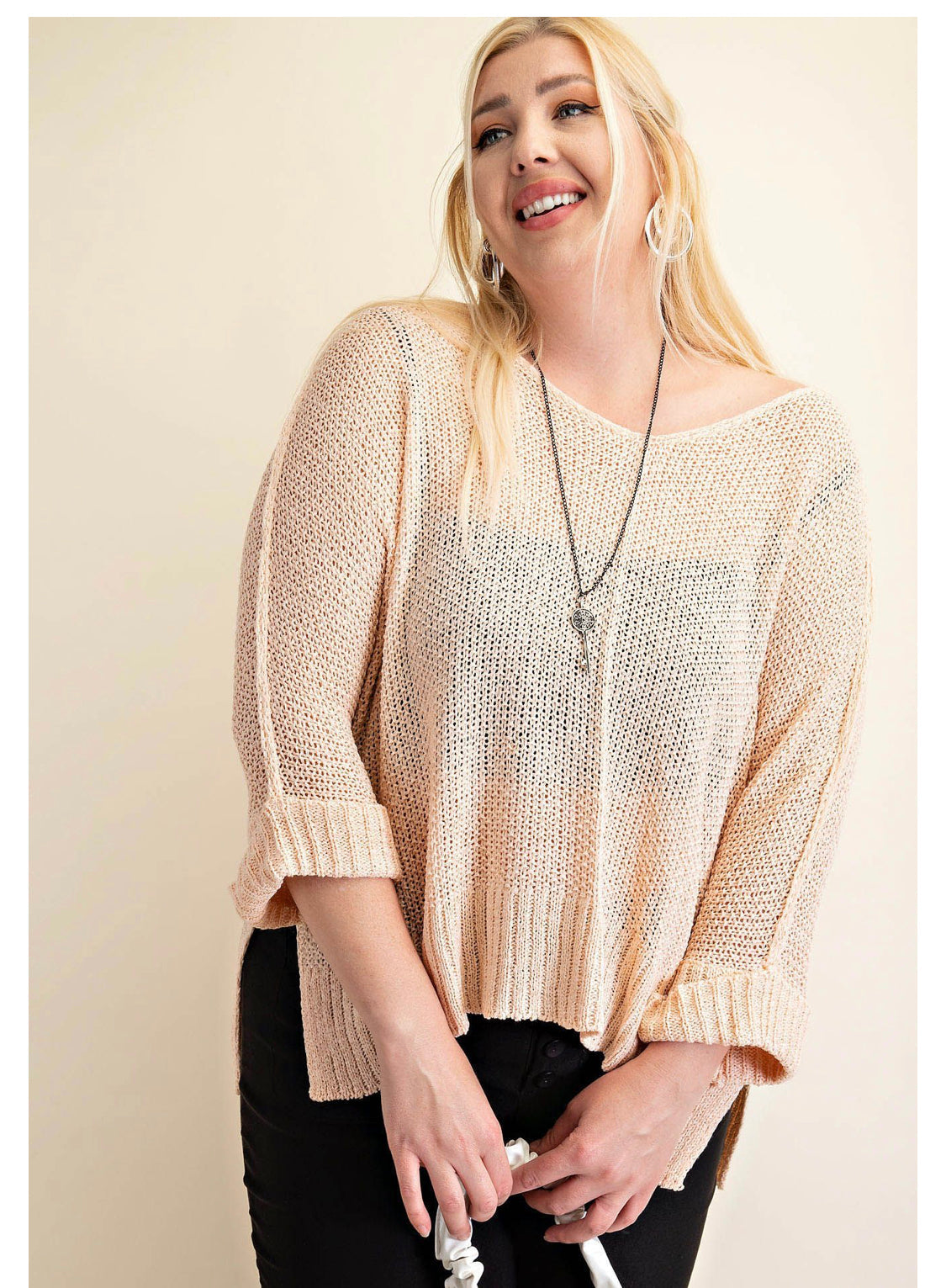 We love this great lightweight sweater to go with all your jumpsuits, jean shorts, skinny jeans, & all by itself! You'll love the versatility, light peach color, side splits, 3/4 length rolled sleeves and shorter length!