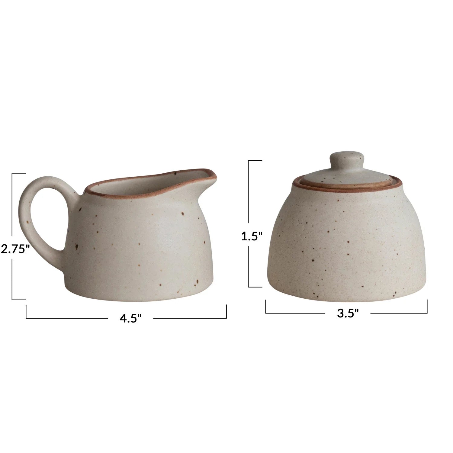 This set of two ceramic creamer and sugar pot is perfect for those looking for a classic and timeless kitchen accent. The 8-ounce cream-colored speckled stoneware creamer and sugar jar provide you with the perfect vessels for your favorite cream and sugar. Sized at 4-1/2"L x 3-1/2"W x 2-3/4"H and 3-1/2" Round x 1-1/2"H respectively, this set brings elegance and convenience to any kitchen.