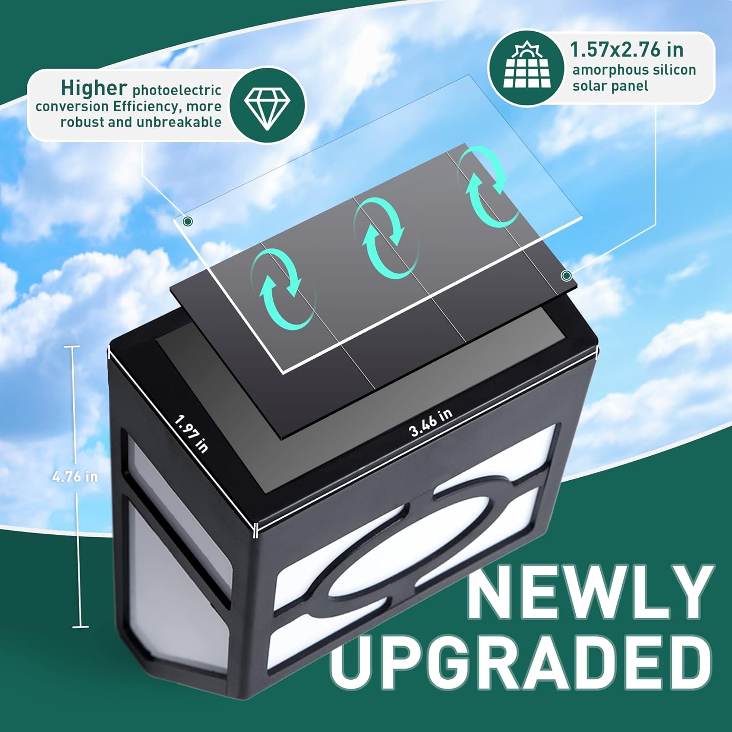 Solar lights are about 4.65 × 3.39 inches / 11.8 × 8.6 cm and can be installed in different places according to your needs, adding color to life, intelligent light control, automatic charging in the sun, and can be lit at night 6 to 12 hours.