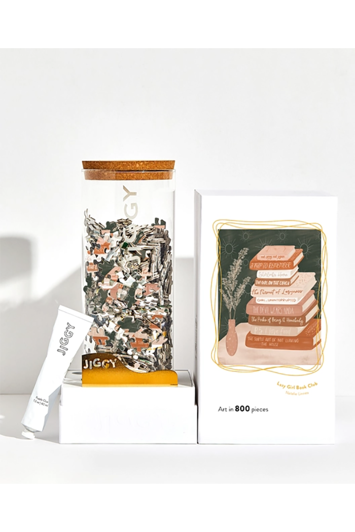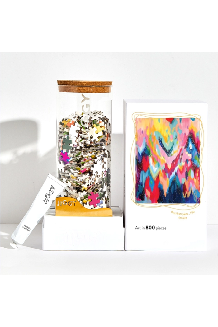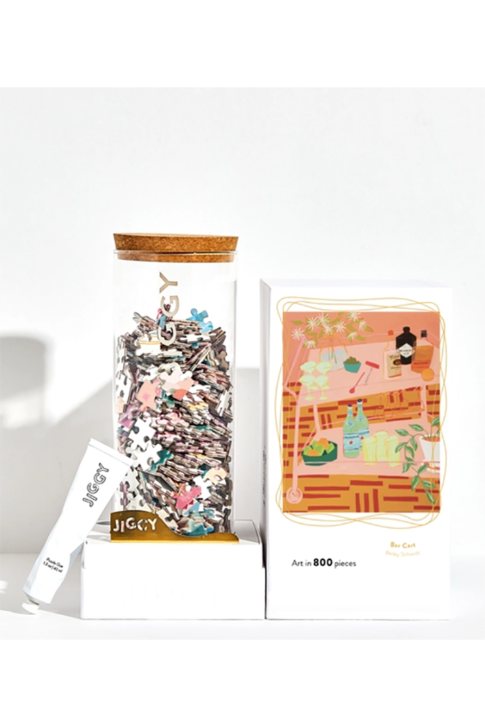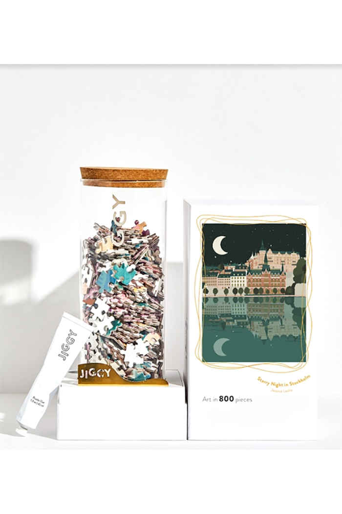 Each JIGGY puzzle comes in a reusable glass jar and includes a tube of puzzle glue, a straight-edge tool to spread the glue, and a print of the art to follow.
