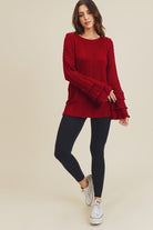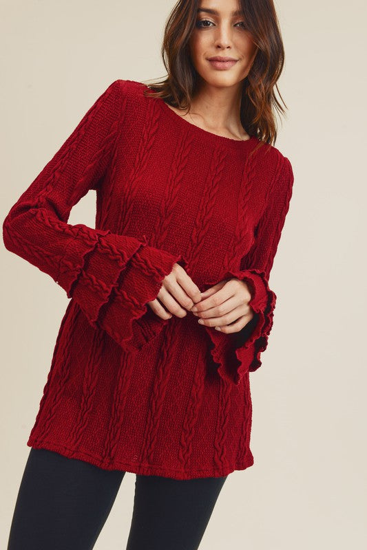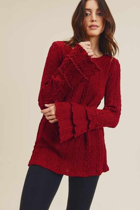 RUFFLE TIER SLEEVE CABLE KNIT SWEATER