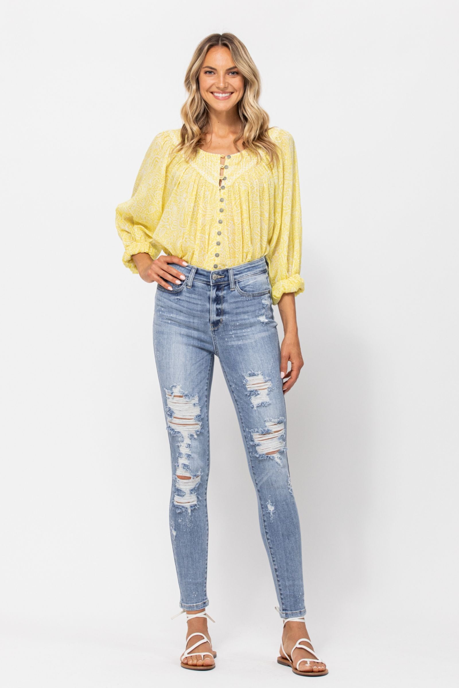 82293 Kady Hi-Rise Bleach Splash Destroyed Skinny Judy Blue Jeans