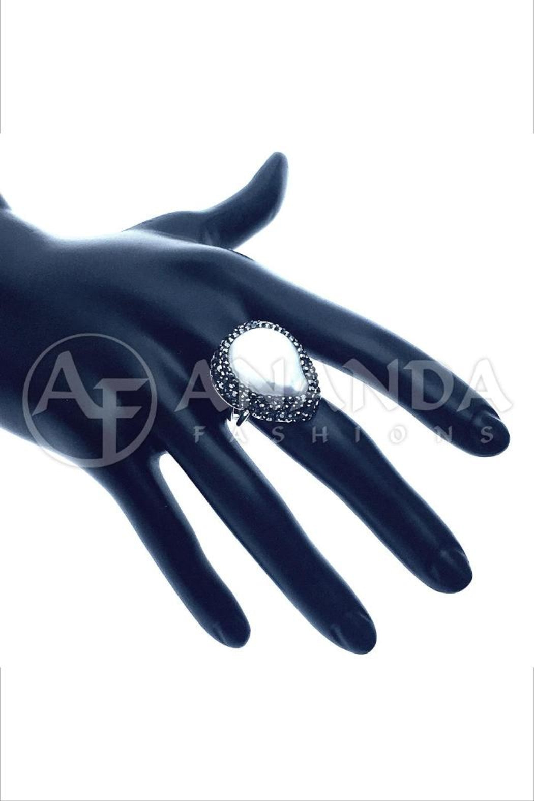 Handcrafted 925 Silver Ring with Cultured Pearl, Hematite and Swarovski Crystals. Size adjustable. Rhodium overlay.