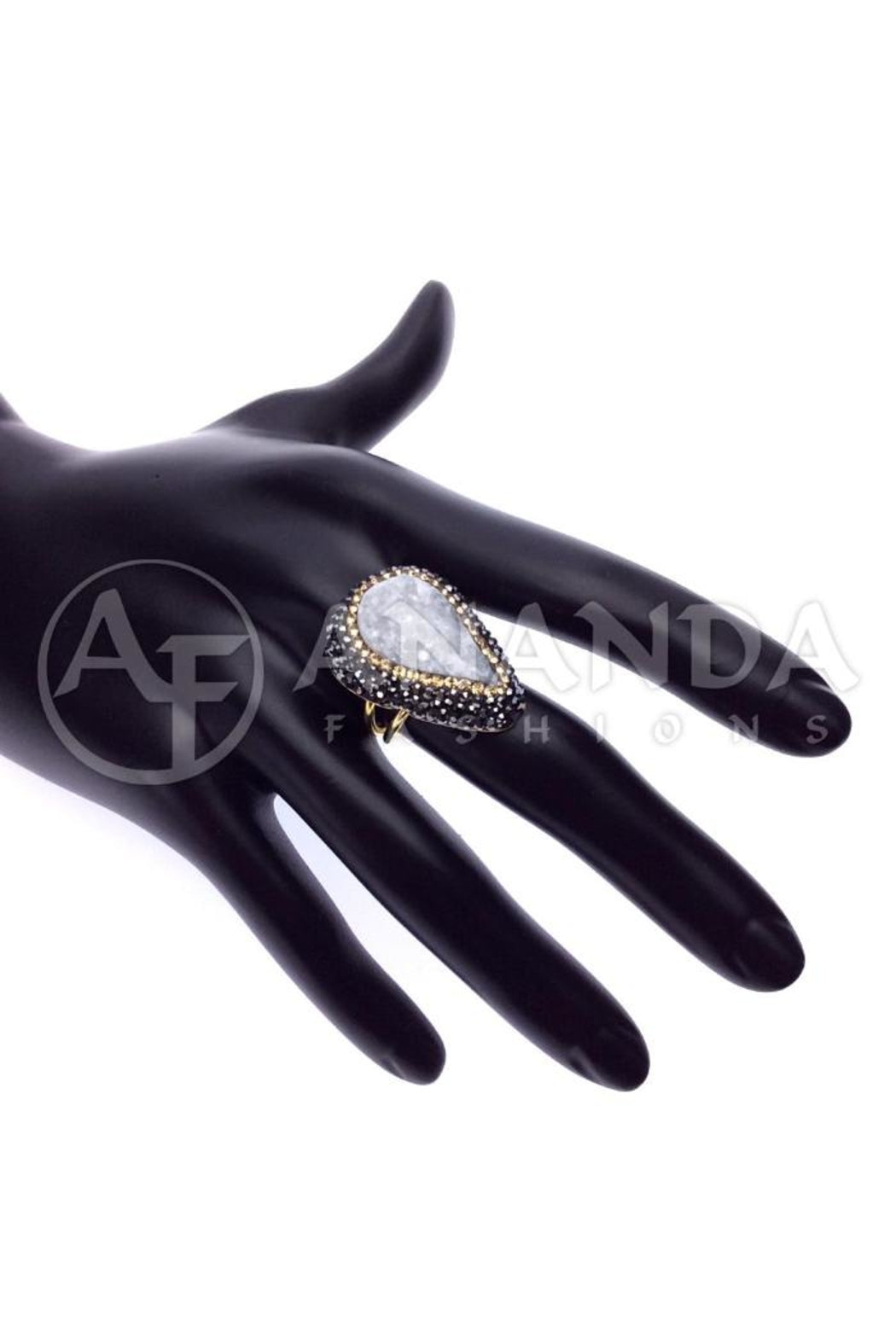 Handcrafted 925 Silver Ring with Chalcedony, Hematite and Swarovski Crystals. Size adjustable. Gold overlay.