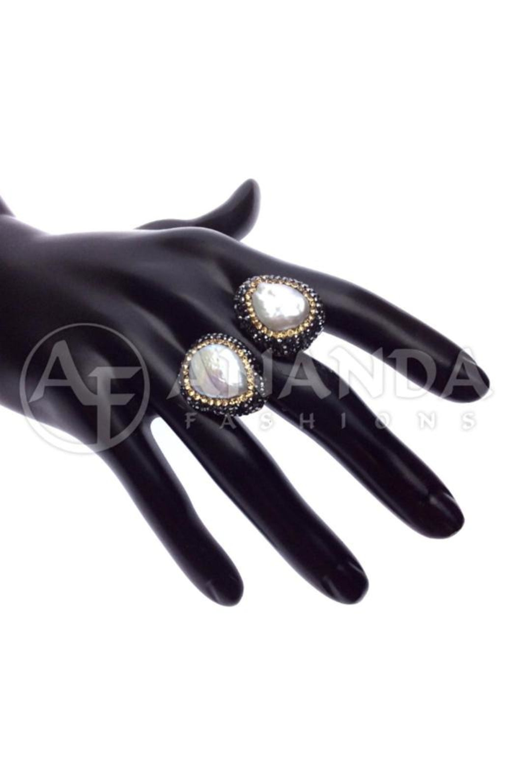 Handcrafted 925 Silver Ring with White Gemstones, Hematite and Swarovski Crystals. Size adjustable. Gold overlay.