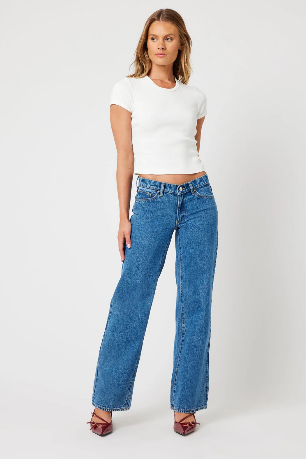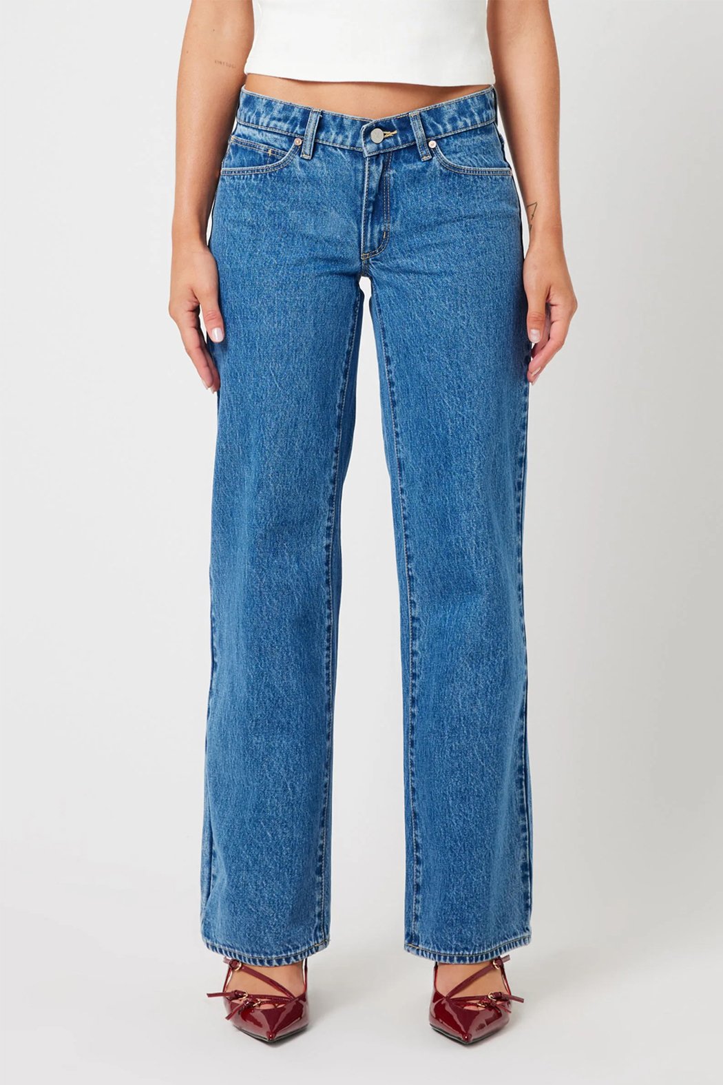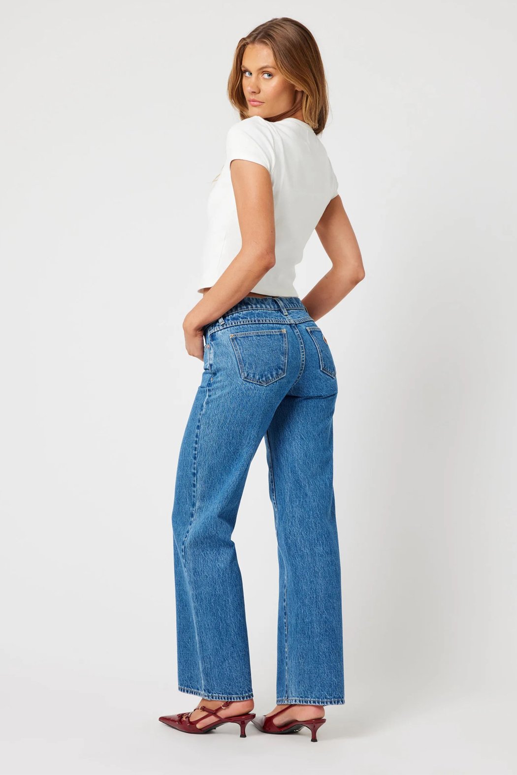 The 99 Low and Wide in Chantell is a rigid denim made from 100% organic cotton in a mid blue wash that gives the look and feel of a vintage pair of jeans. We recommend sizing up 1-3 sizes from what you wear in a high rise jean depending on your waist to hip ratio (if you have a smaller waist and larger hips go up 2-3 sizes, if your waist and hips are not all that different than you may only need to go up one size). Pair these classic jeans with sneakers and a crewneck sweater for a timeless look.