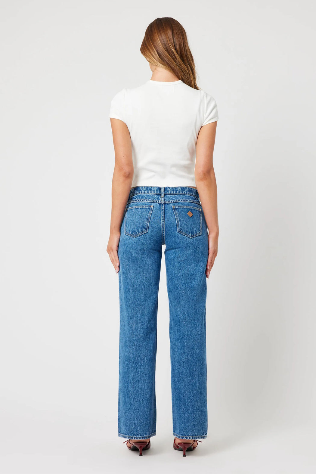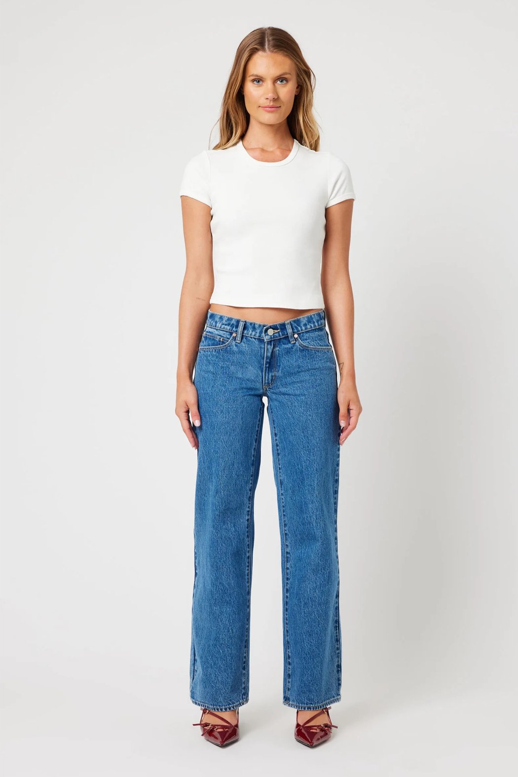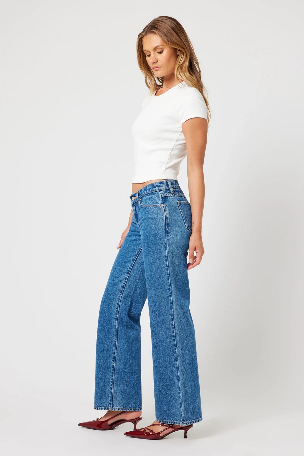 The 99 Low and Wide in Chantell is a rigid denim made from 100% organic cotton in a mid blue wash that gives the look and feel of a vintage pair of jeans. We recommend sizing up 1-3 sizes from what you wear in a high rise jean depending on your waist to hip ratio (if you have a smaller waist and larger hips go up 2-3 sizes, if your waist and hips are not all that different than you may only need to go up one size). Pair these classic jeans with sneakers and a crewneck sweater for a timeless look.