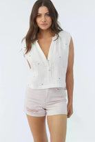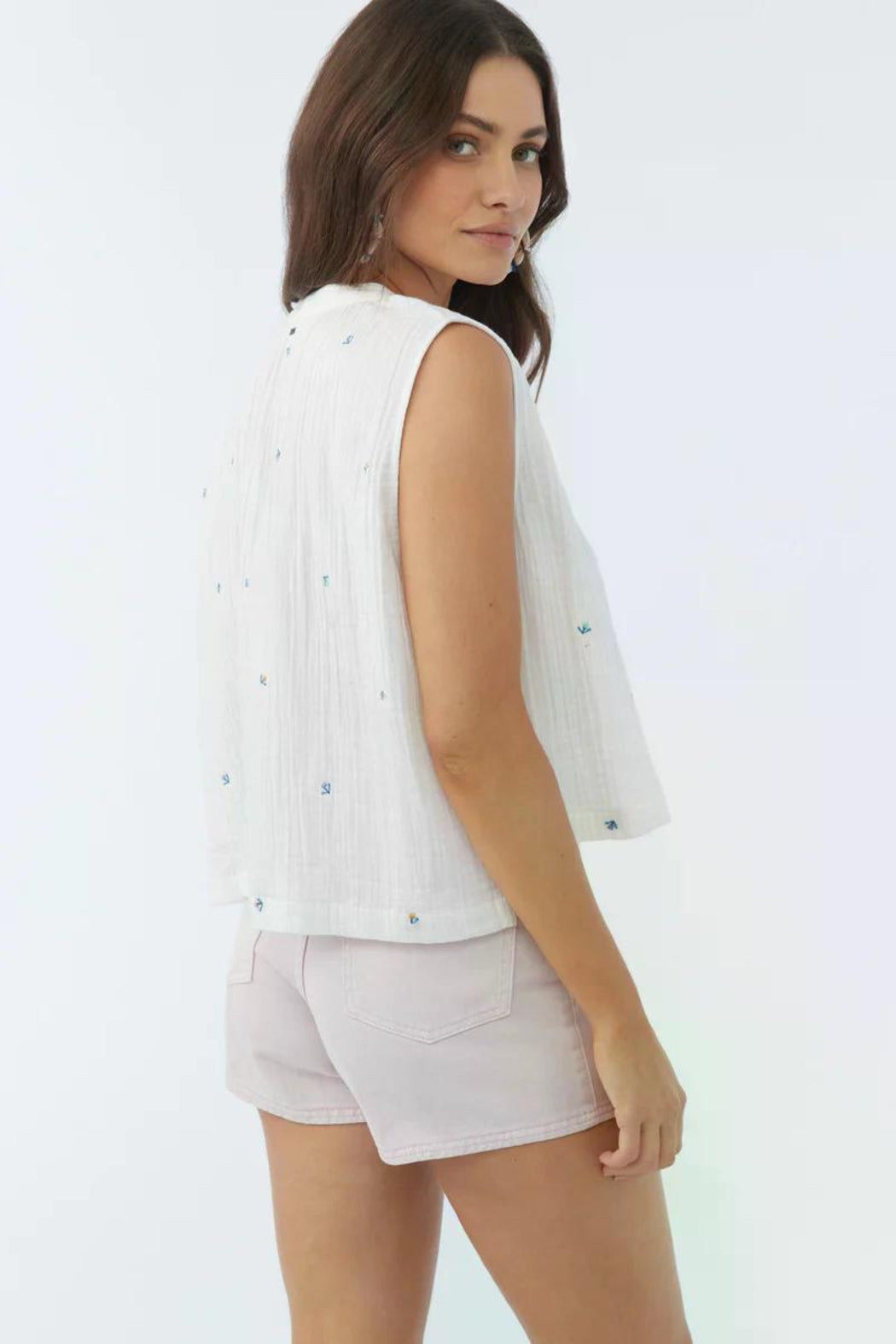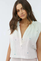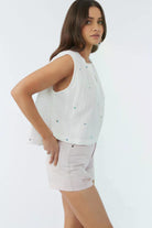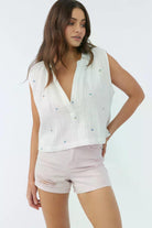 Cute and casual woven tank that has v-neckline, stepped hem detail and skimmer length fit.