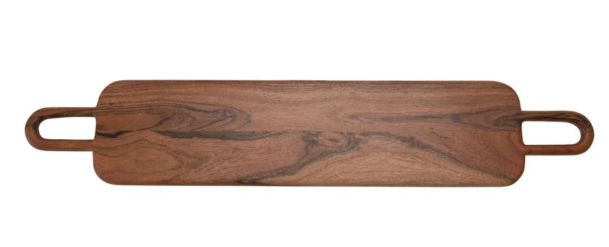 This 32" x 6" acacia wood cheese/cutting board is the perfect way to dress up your kitchen. The natural finish and two handles make it easy to transport, while its size makes it great for cutting and serving various cheeses and appetizers. Impress your friends and family with this high-quality board.