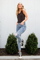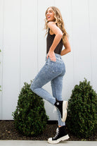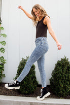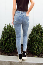 Our Acid Wash Destroyed Hem Skinny Jeans are going to be the perfect statement jeans you need in your closet. Distressing on the knee and thigh with slight distressing throughout, raw hem, high waisted, and ankle length.