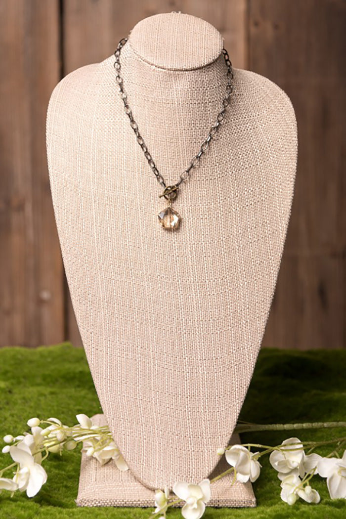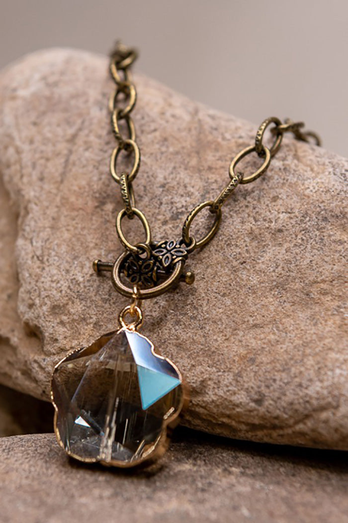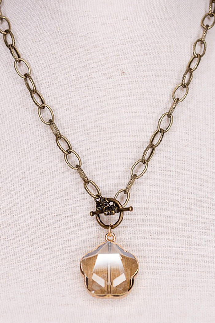 Chain link necklace with a toggle closure at the bottom next to the flower shaped faceted glass pendant. Beautiful dark metal and perfect for layering.