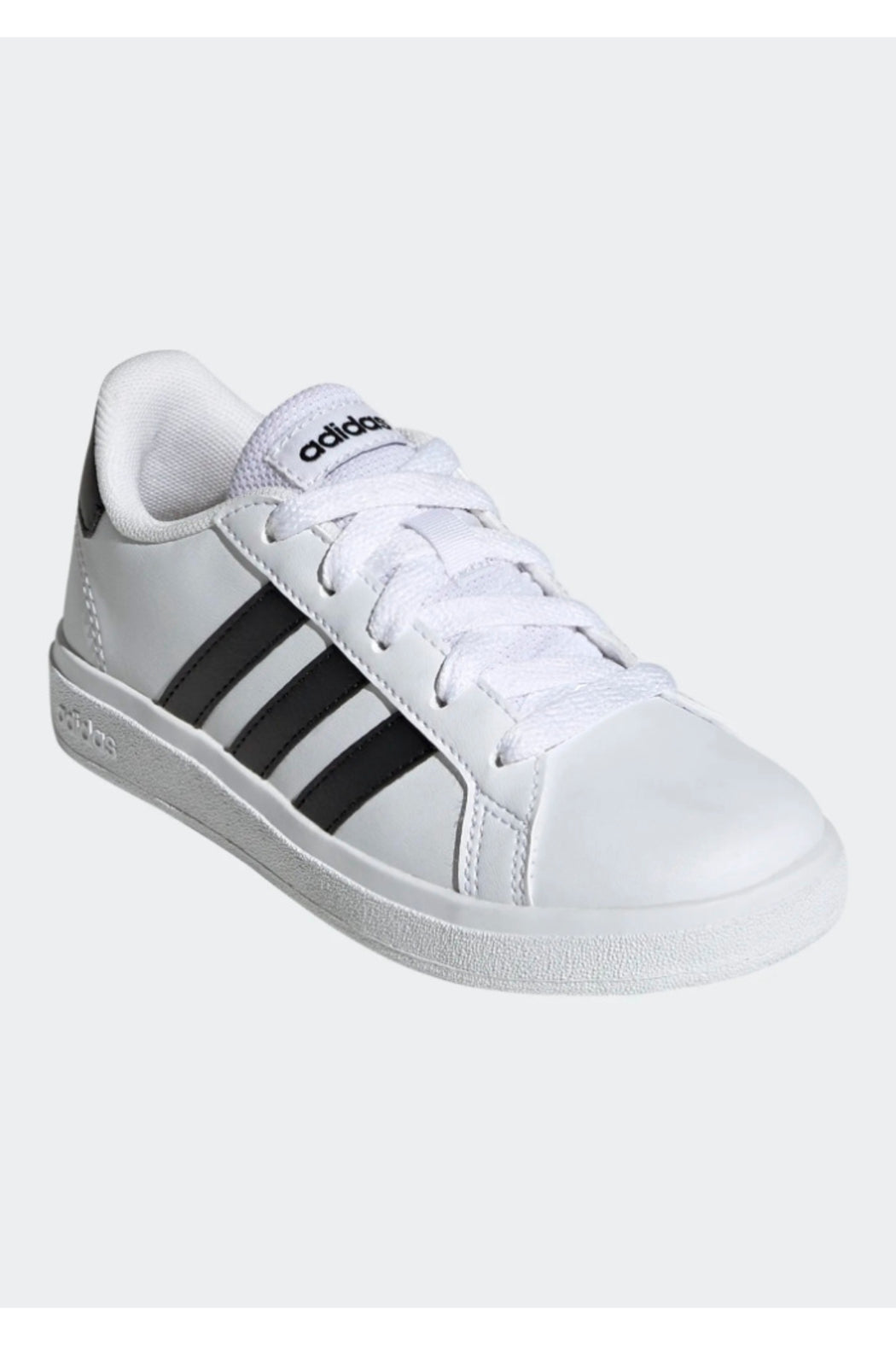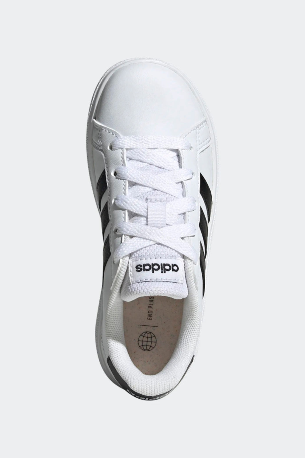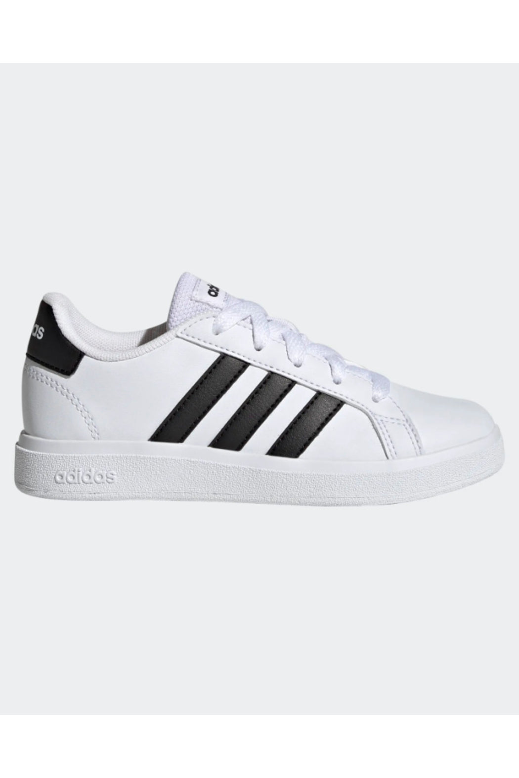 These kids' adidas tennis-inspired shoes have classic style for the blacktop or the classroom. The synthetic leather upper is soft and durable. A rubber cupsole provides the finishing touch. Signature 3-Stripes stand out on the side. Made with a series of recycled materials, this upper features at least 50% recycled content. This product represents just one of our solutions to help end plastic waste.