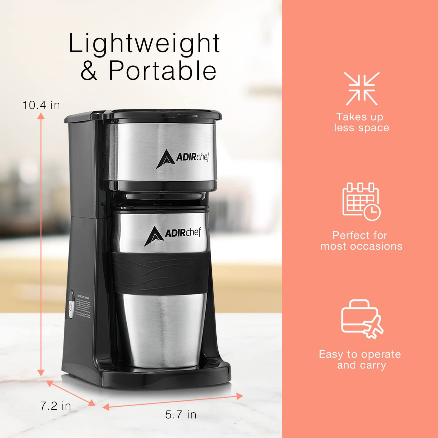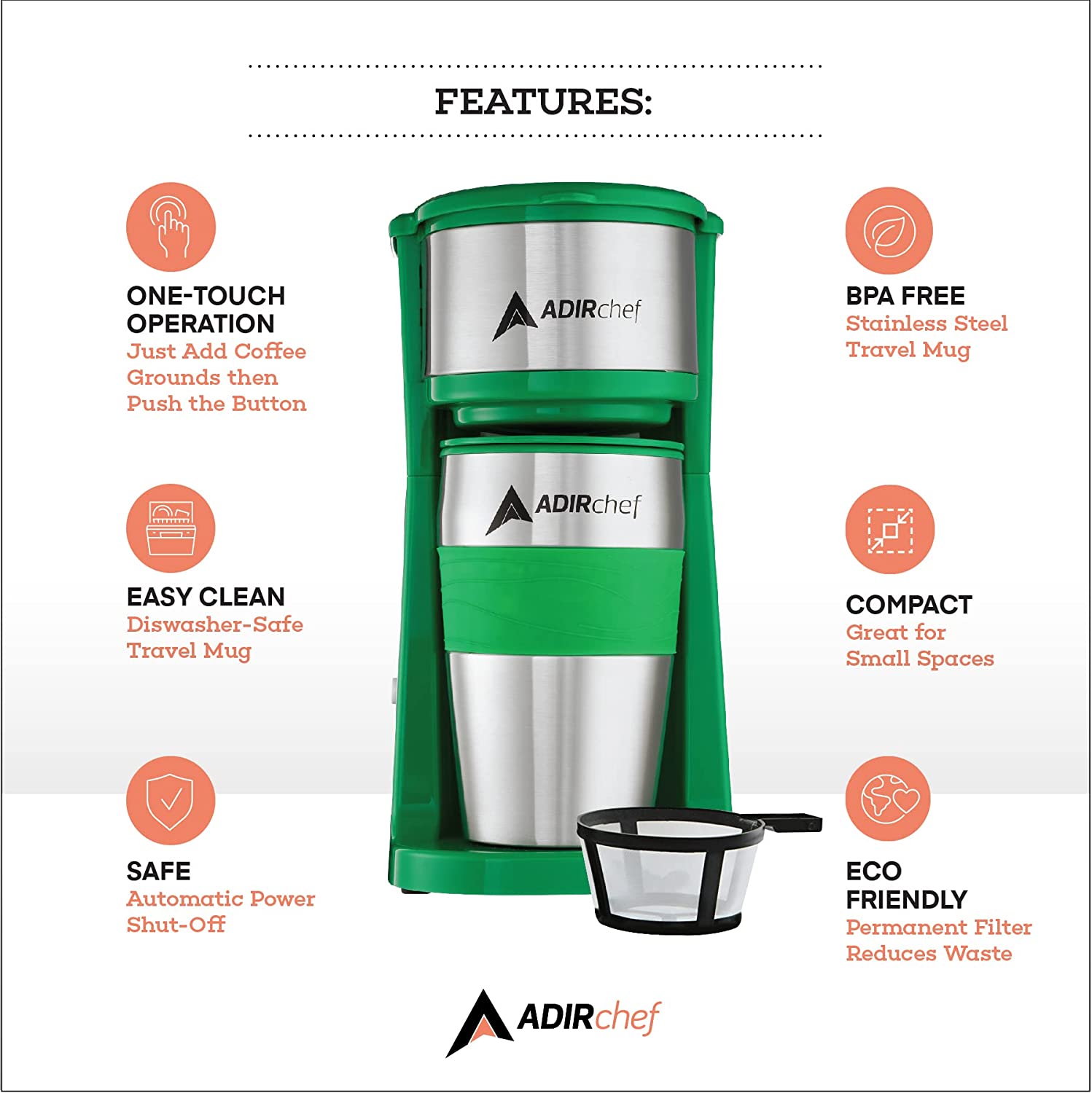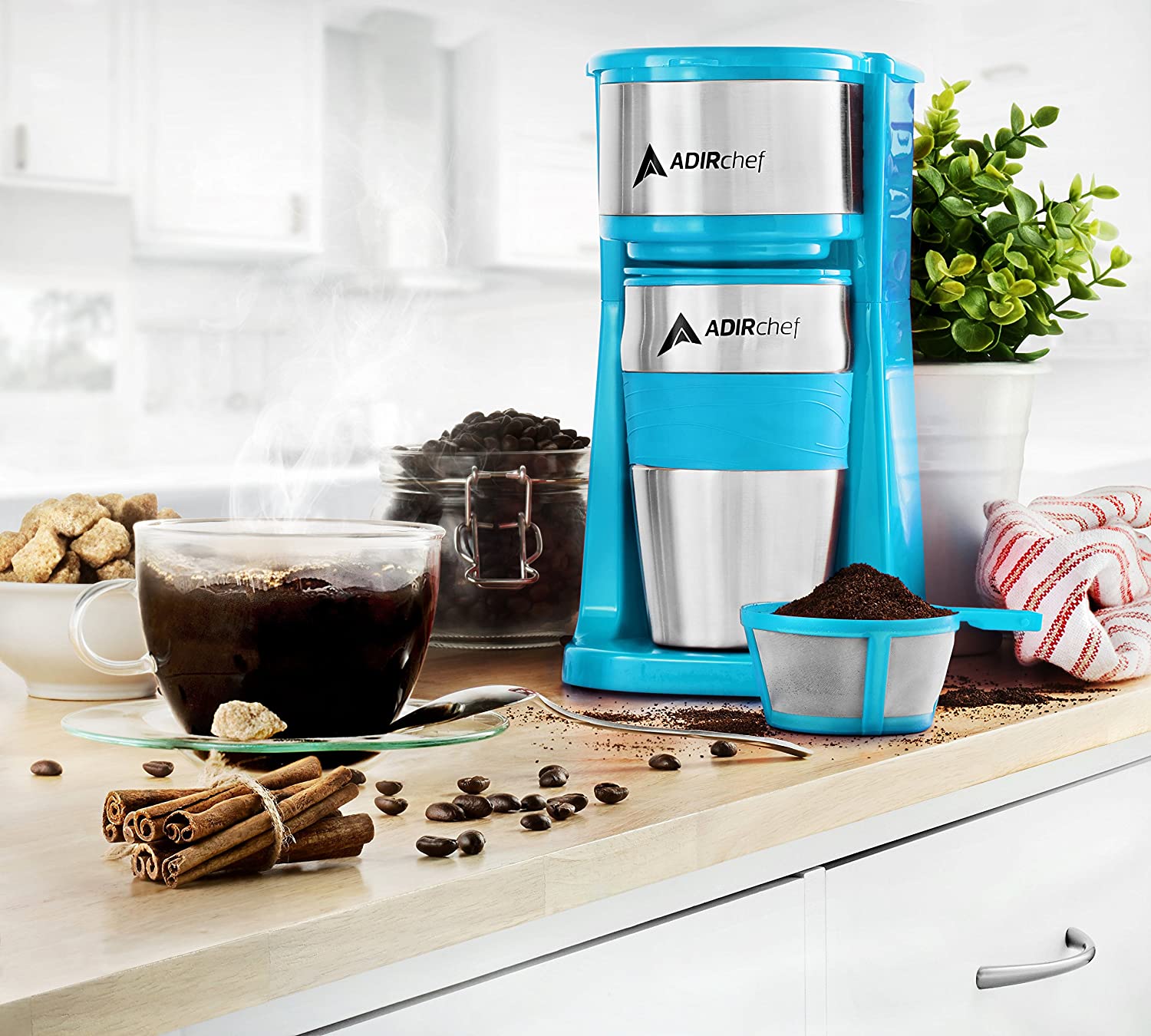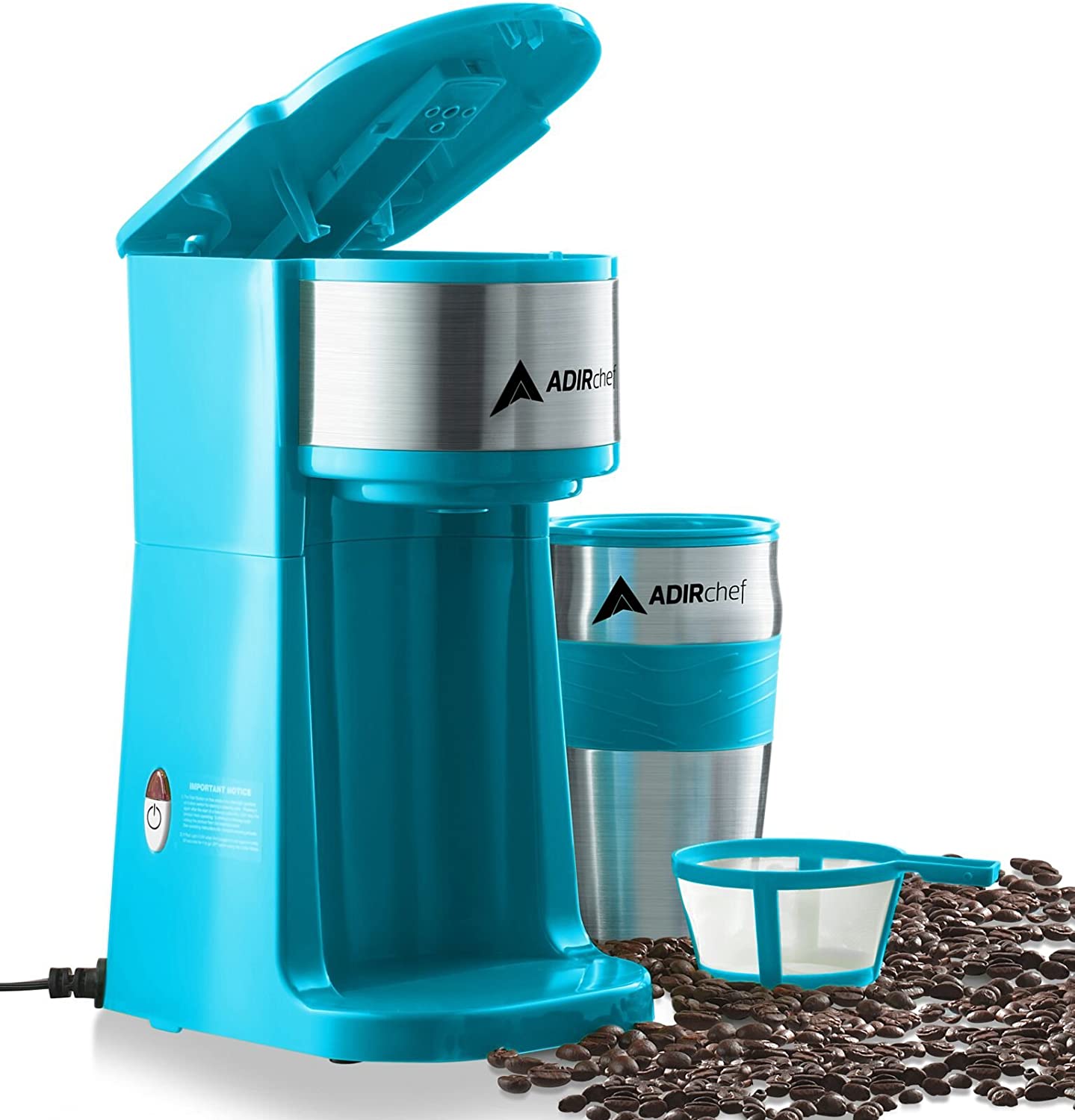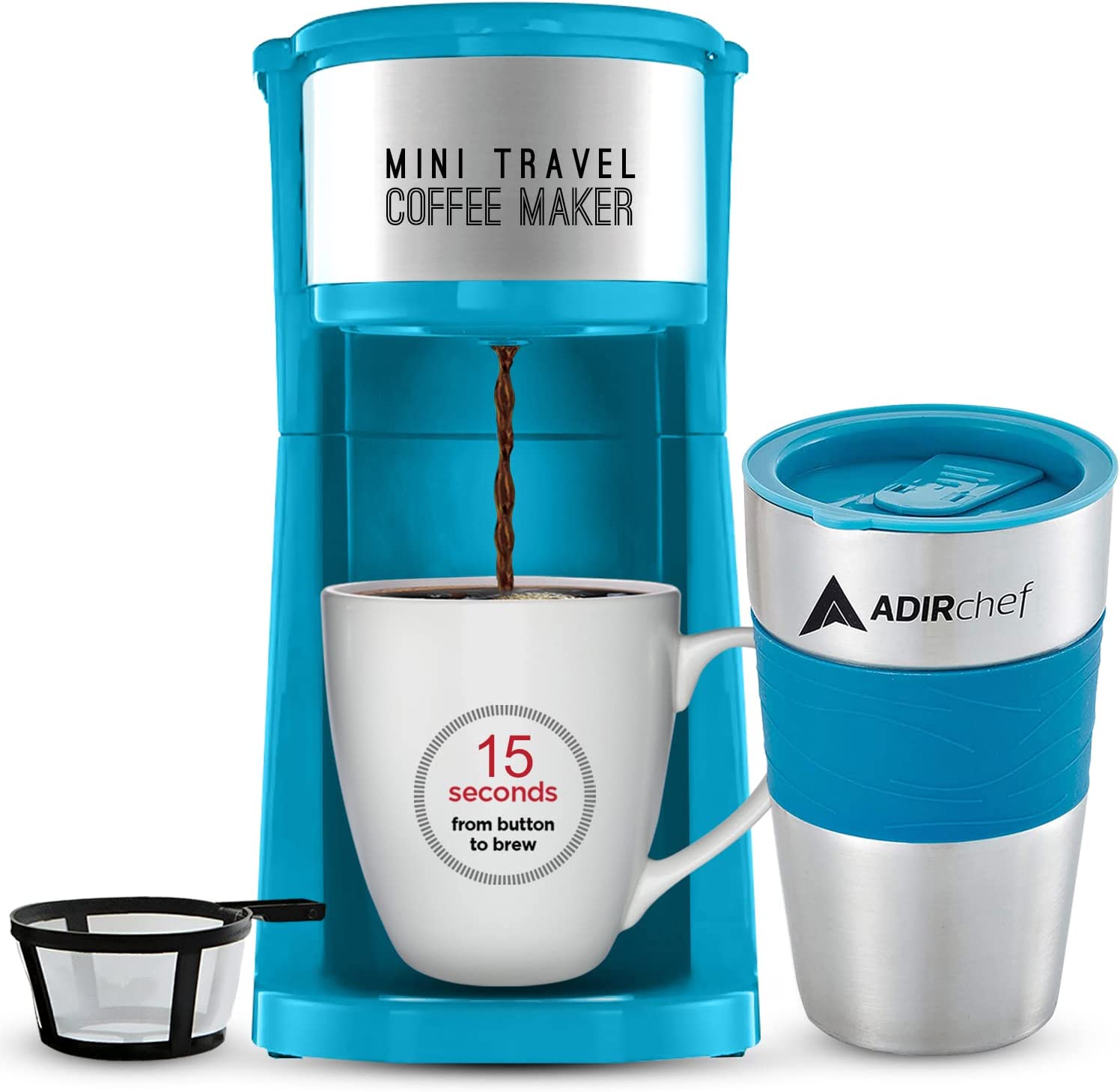 AdirChef Mini Travel Single Serve Coffee Maker & 15 oz. Travel Mug Coffee Tumbler & Reusable Filter