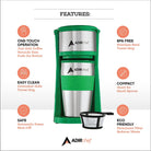 Made using high-quality, durable plastic, you can enjoy a personal cup of coffee from this coffee maker every morning for years to come. It brews directly into the 15-ounce stainless steel travel mug and once the cup is full, the maker automatically shuts off to save power.