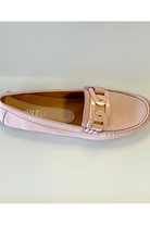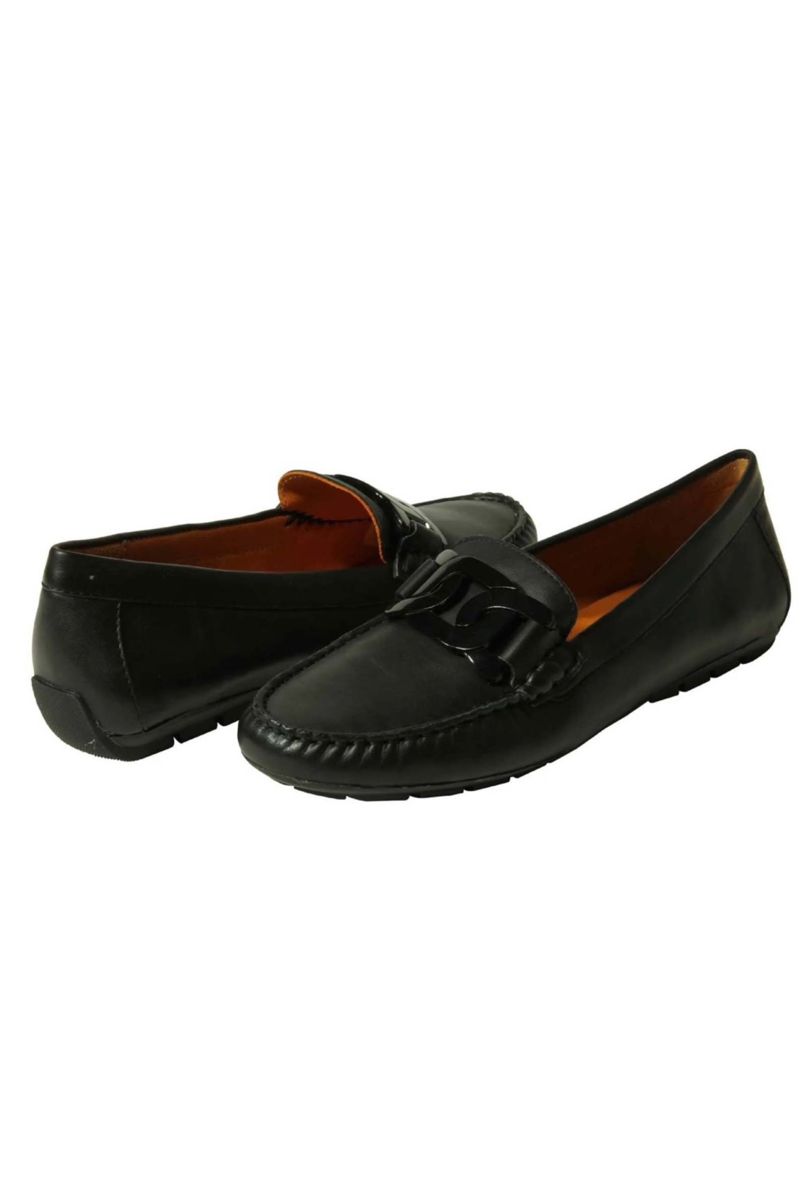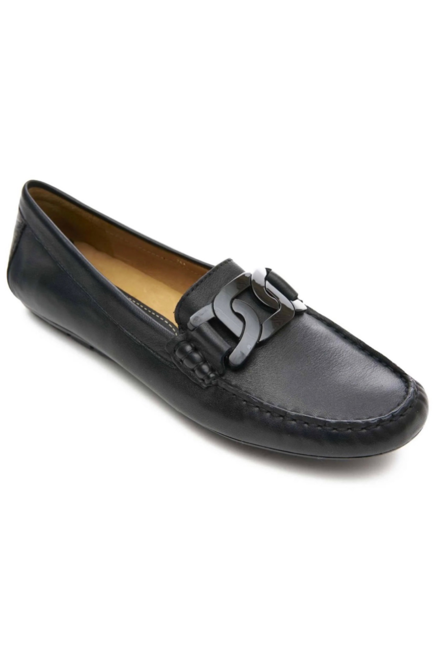 Driving moccasin in ultra-soft glove leather. Fully leather lined. Matching chain accent. Half-inch rubber driving sole.