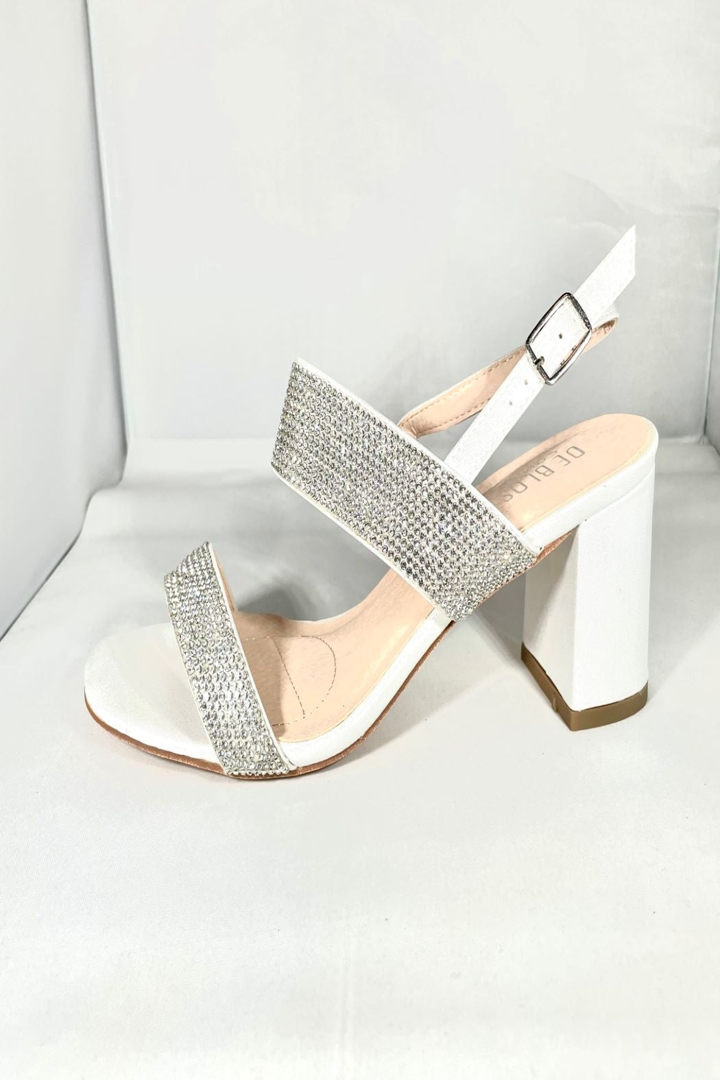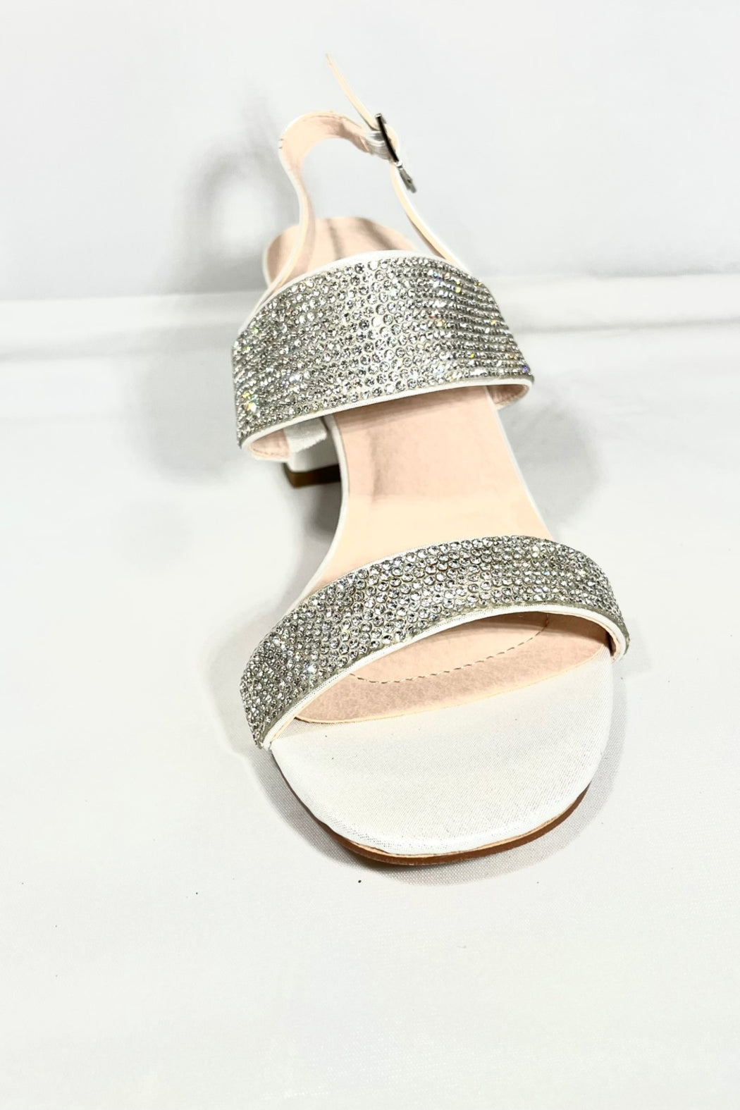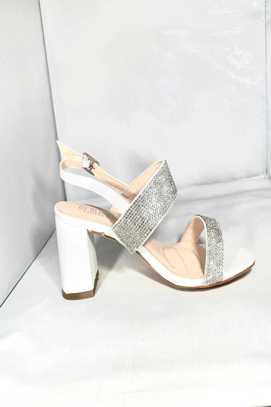 These shoes are perfect for all occasions. They have a 2.5" block heel with an adjustable ankle strap. The heel is a white shimmer with a silver sparkle toe strap. They also feature some extra padding for all day comfort.