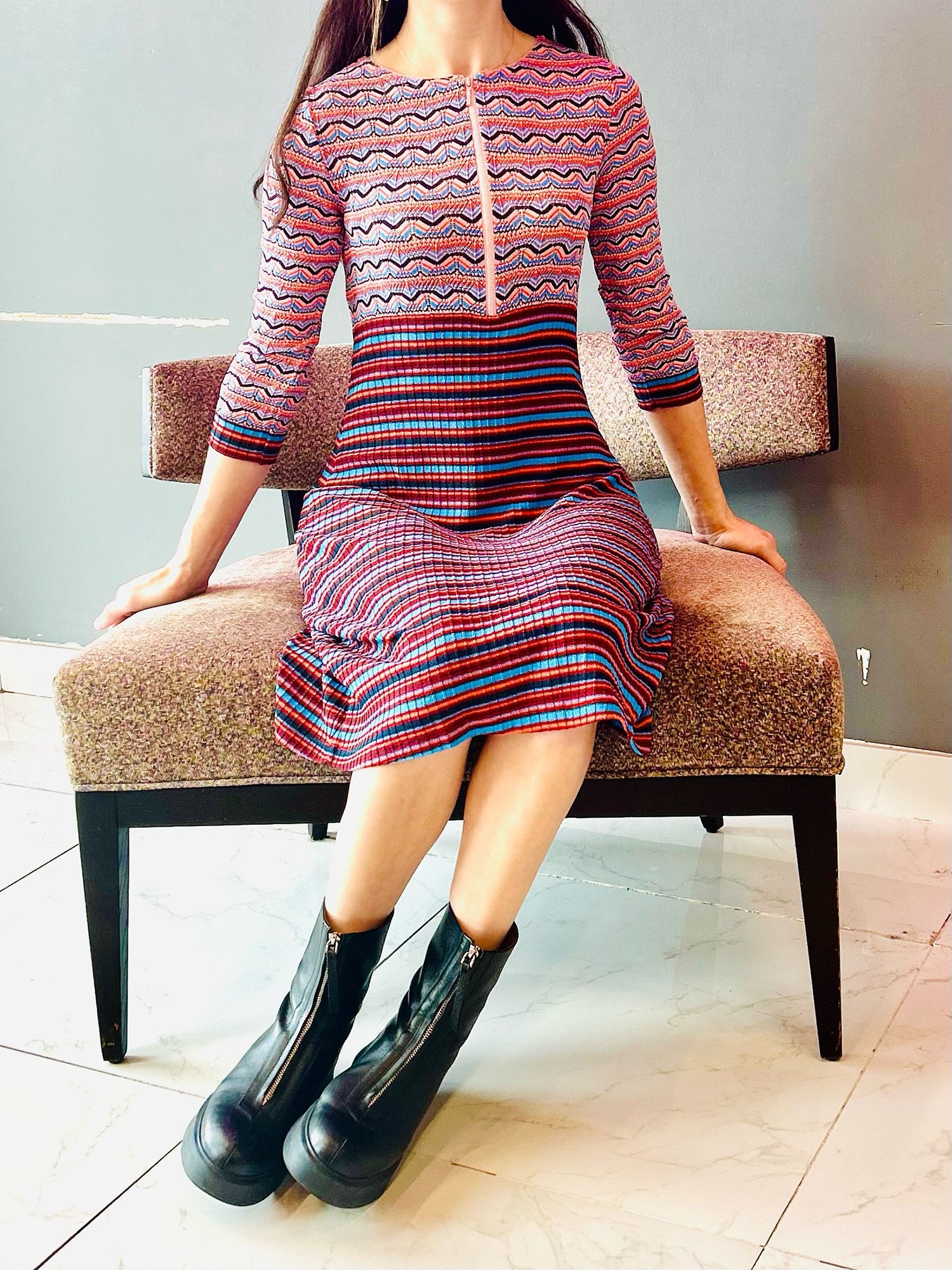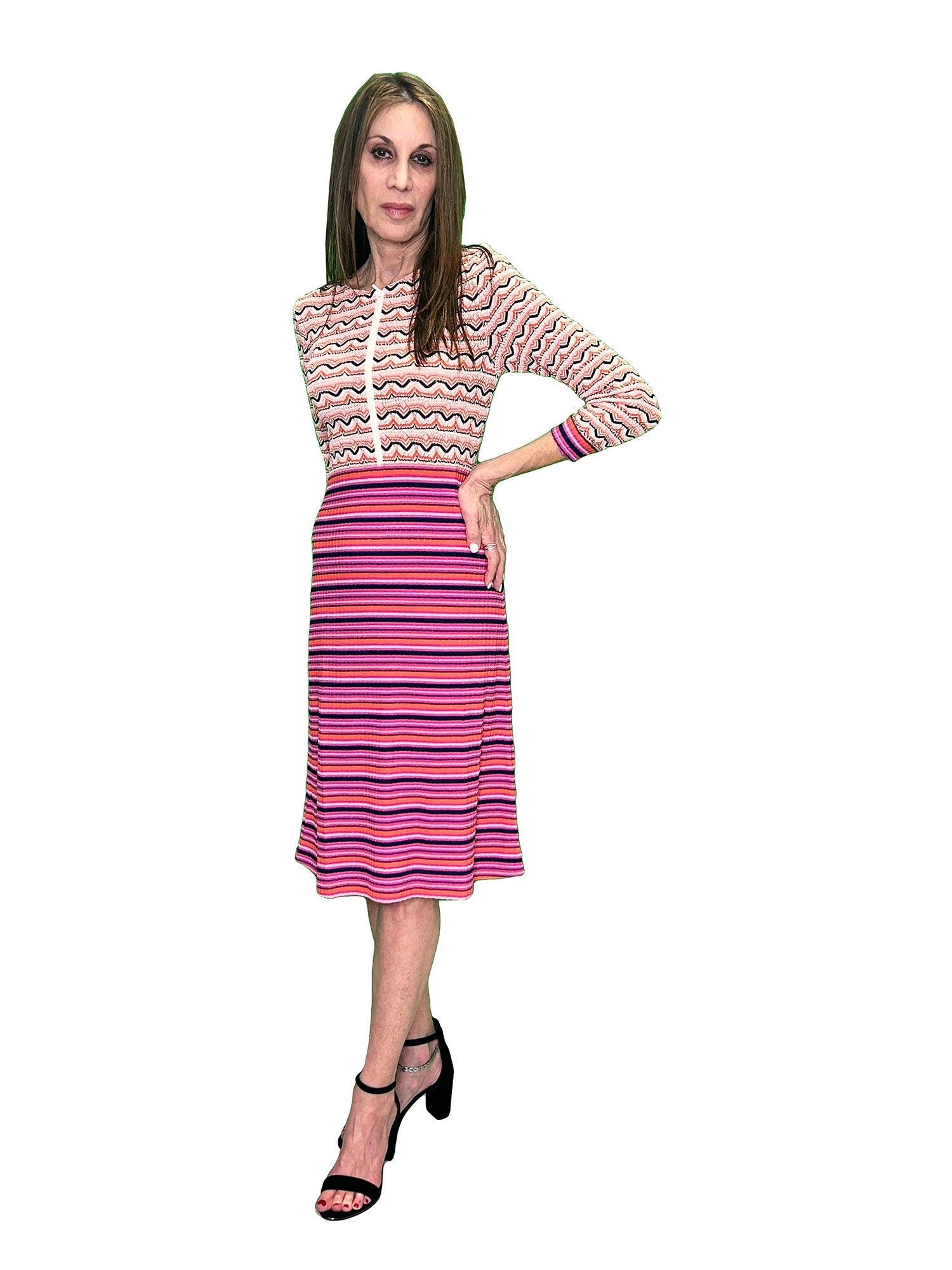 •LOOK: A perfect fine gauge knit dress for spring and summer from Aldo Martins. The mixed patterns and texturized feel are right on trend for the season. Long sleeves, crew neck with front zipper and midi length. For fun, try leaving it unzipped with a tank or tee underneath. Looks great with blue or white denim for a more carefree look. Don’t be afraid to wear this dress to work as it is business appropriate. Fabulous with a cropped solid cardi to keep the chill away.