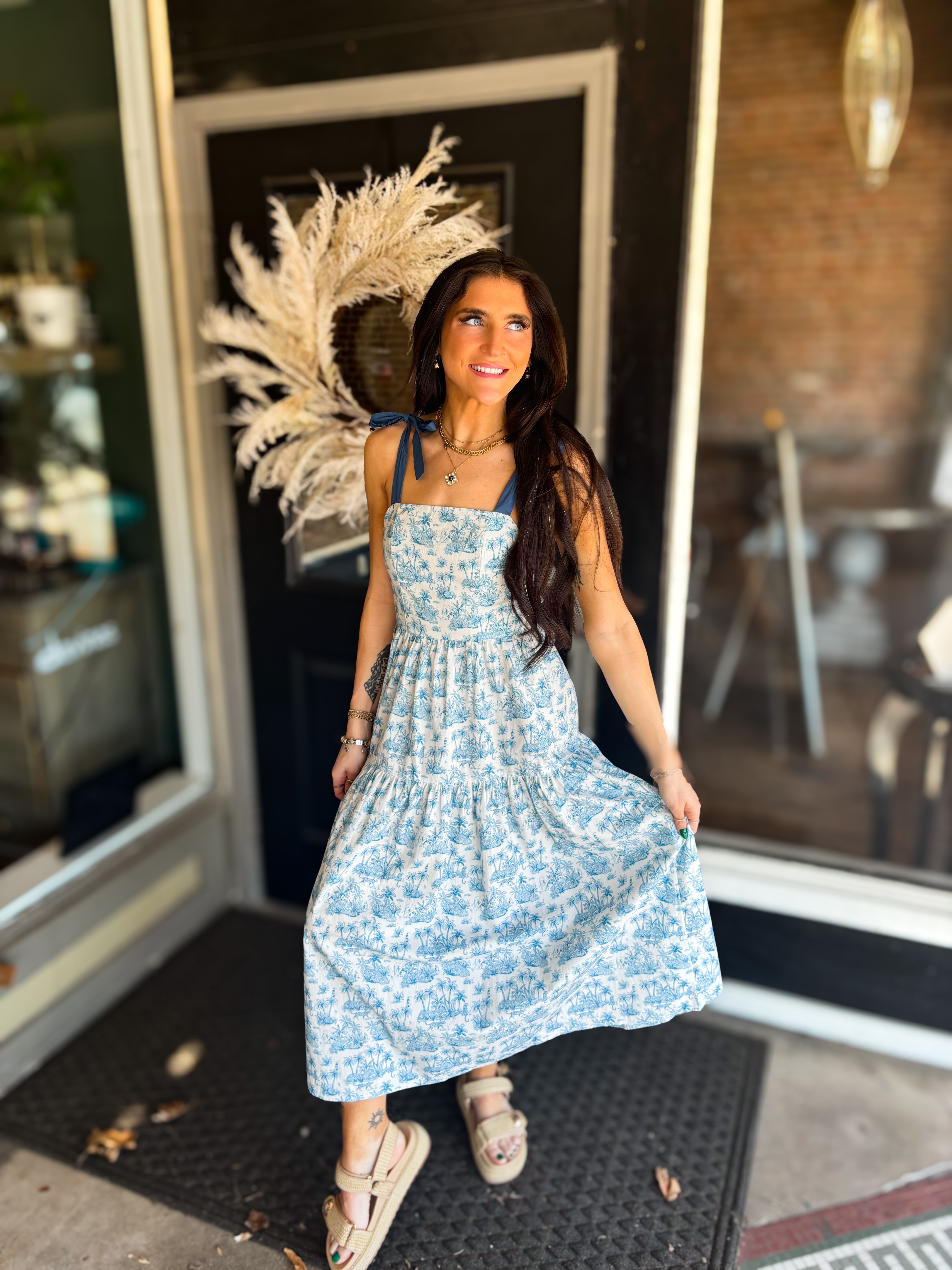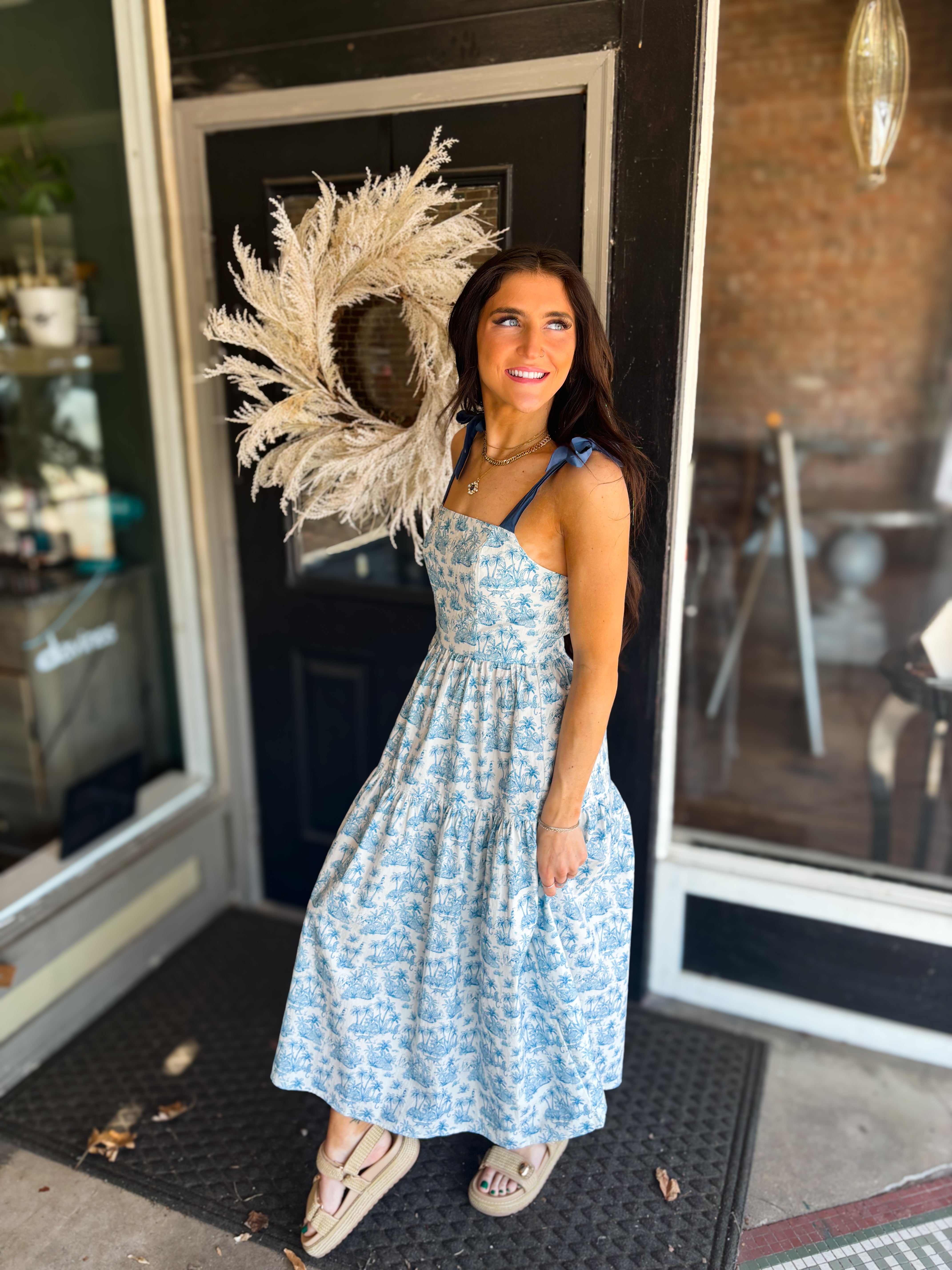 Unleash your wild side with the Alexa Dress in Blue Jungle Toile! This playful maxi dress features a fun blue toile jungle print and tie shoulders for a touch of whimsy. The flattering smocked bodice adds a touch of comfort, making it the perfect dress for any occasion. Let your inner jungle queen shine!