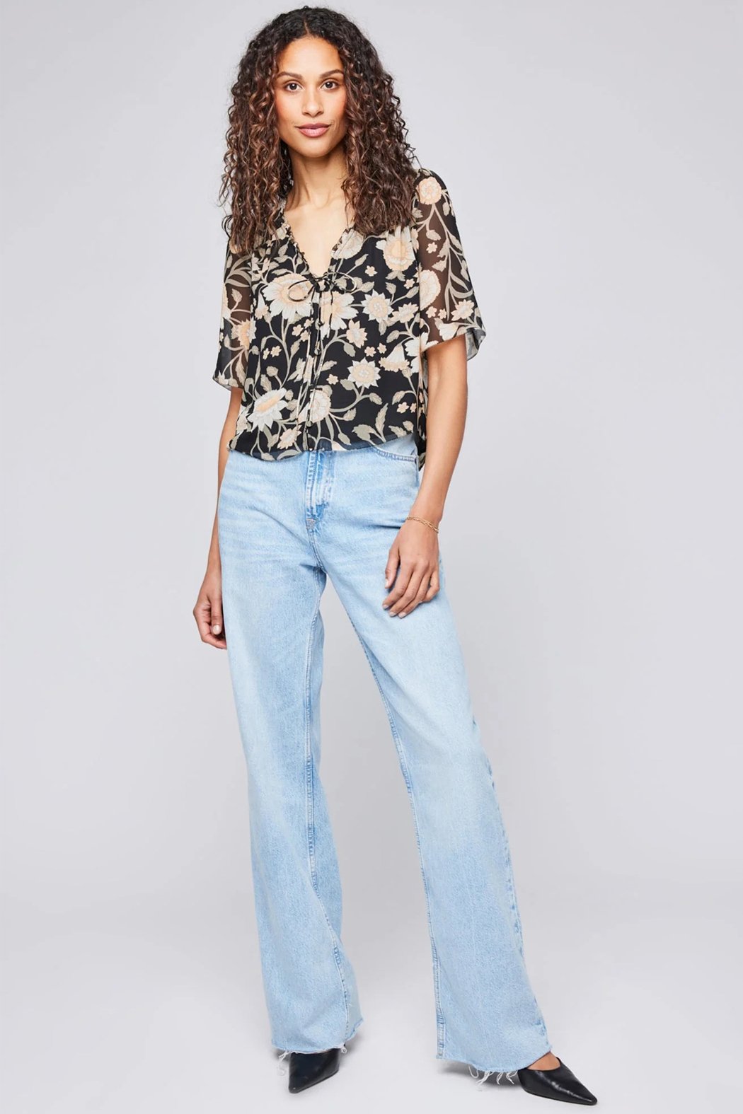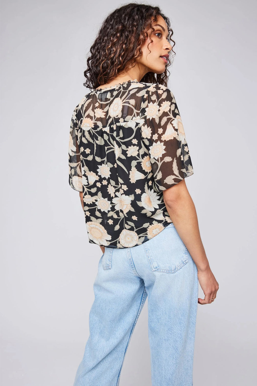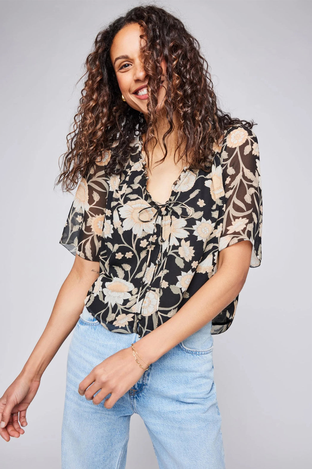 Made of a light weight chiffon fabric and featuring a unique floral pattern, the Alexandra Blouse is perfect for anything from a date night to a day at the office. The flattering v-neckline with ruffle and tie details includes fabric covered buttons and a lined bodice for ease of wear.