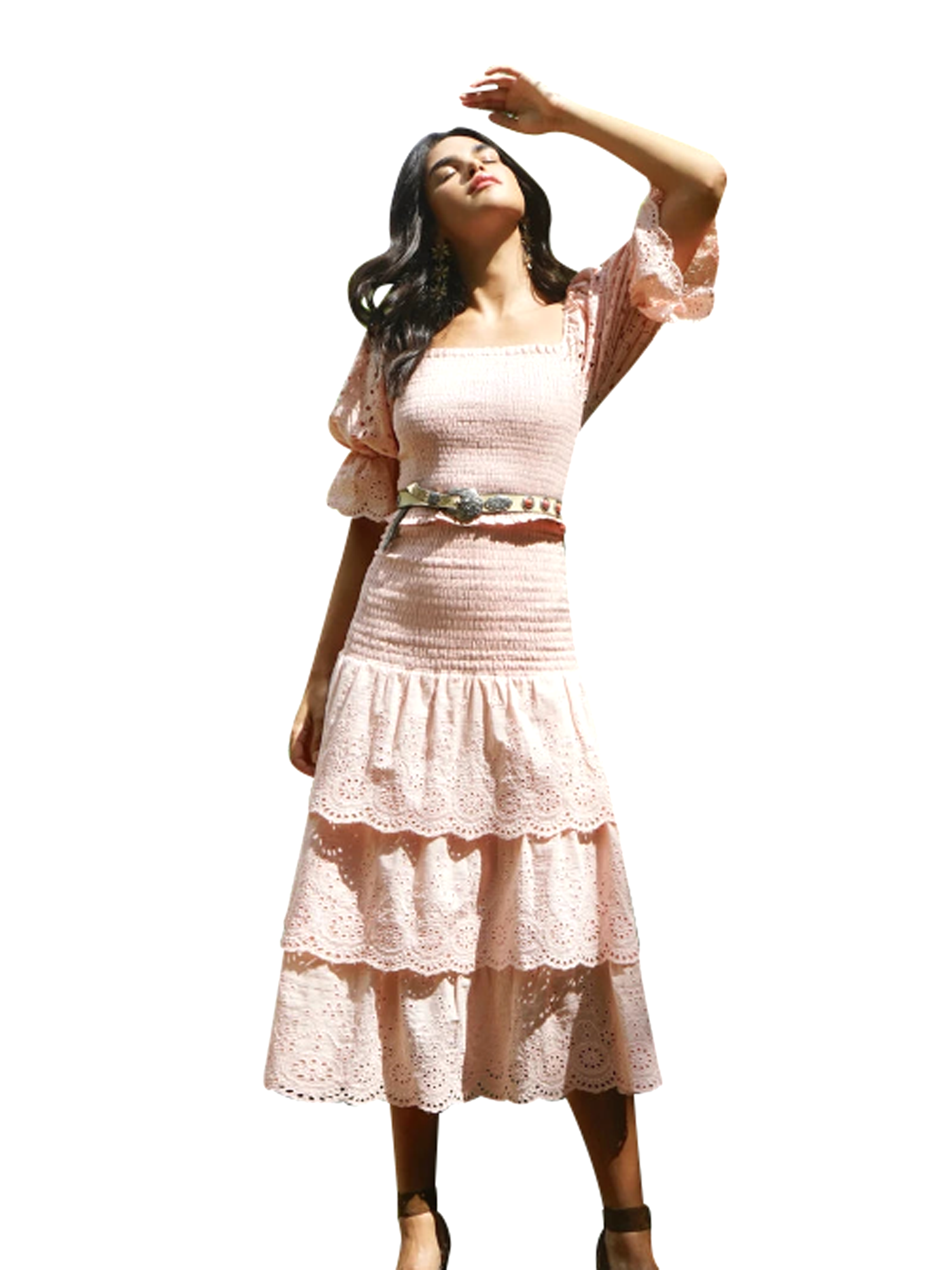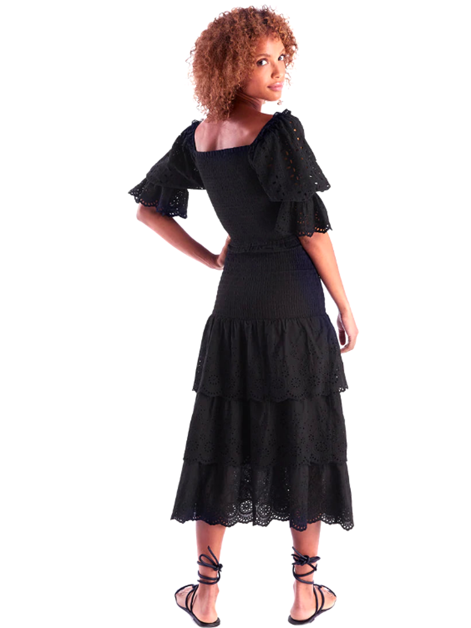 The Dani Midi Skirt features a pull on style with a smocked elastic waist. Fitted throughout the hips and ending in 3 embroidered tiers at a mid-calf length. Fully lined.