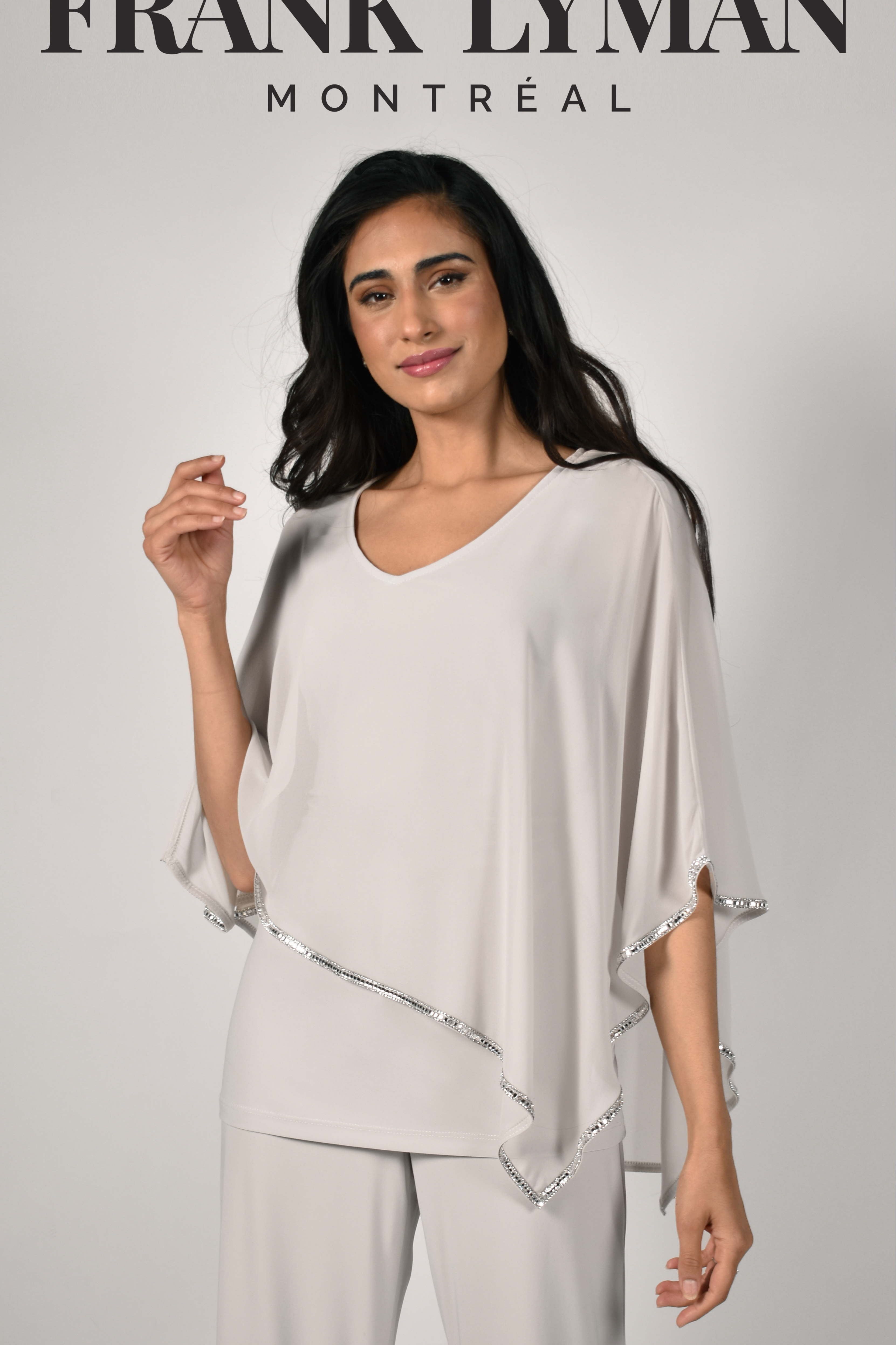 This almond woven top is a very flowy top that has a fitted tank top that it connected underneath. It has a beautiful rhinestone edge that catches the light. The chiffon overlay just flows as you walk. You could easily pair this top with any kind of bottom to either dress it up or dress it down.