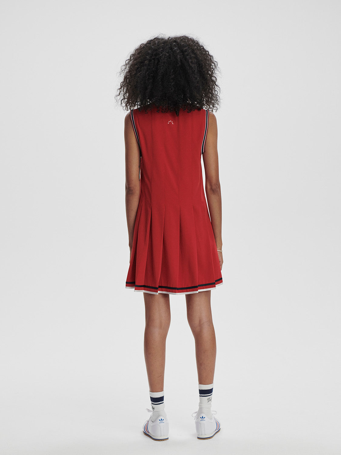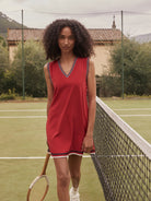 Made from lightweight Stretch Twill, this dress features a standard V-neckline and an A-line silhouette with a pleated back and tape hem detail. Unlined for breathability, it requires a bra and shorts underneath.
