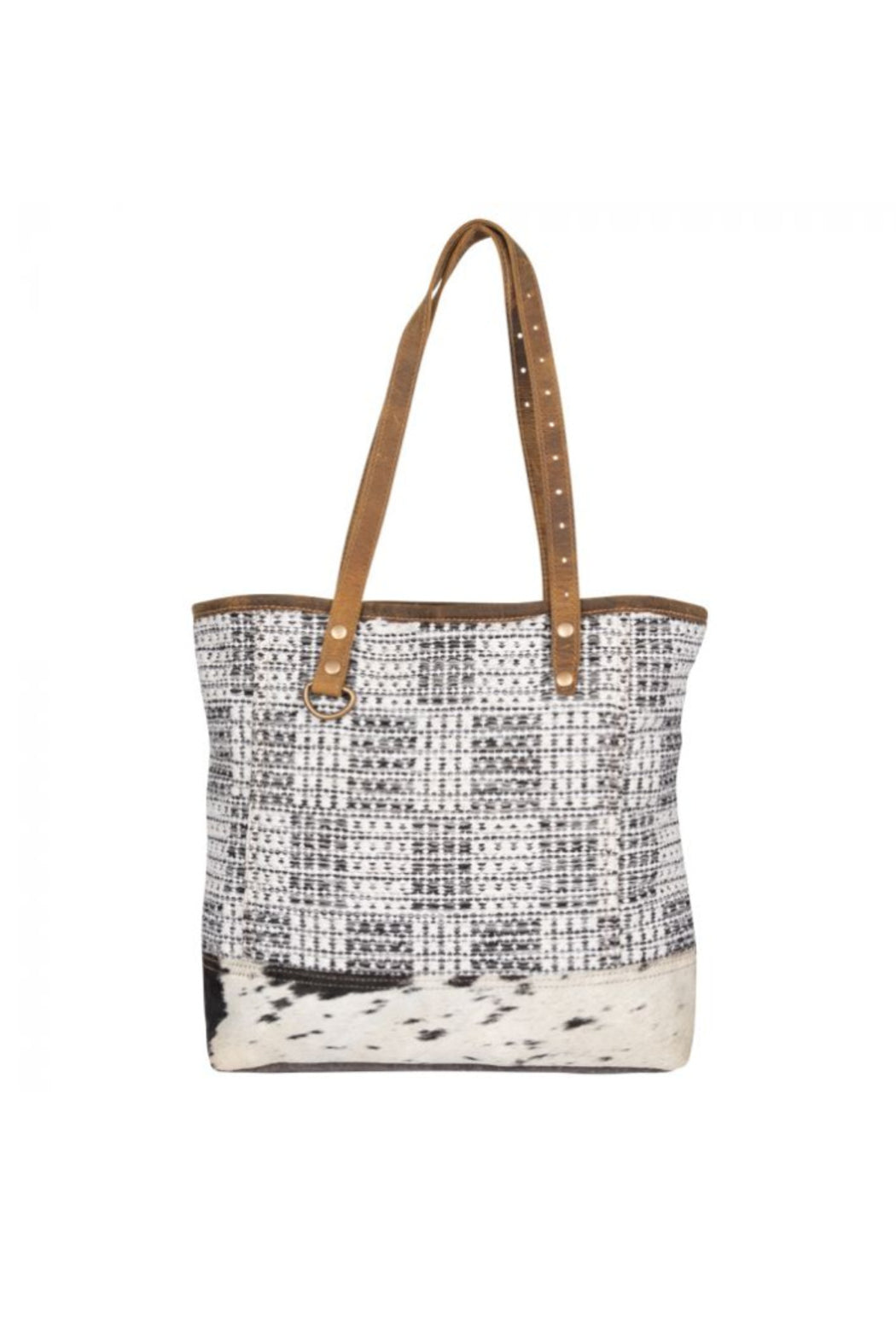 Crafted to a standard of perfection, this bag flaunts a unique design detailed with Hairon Hide, Leather and Berber. Inside pockets. Hide coloring and markings may vary on each bag. Tote Strap.
