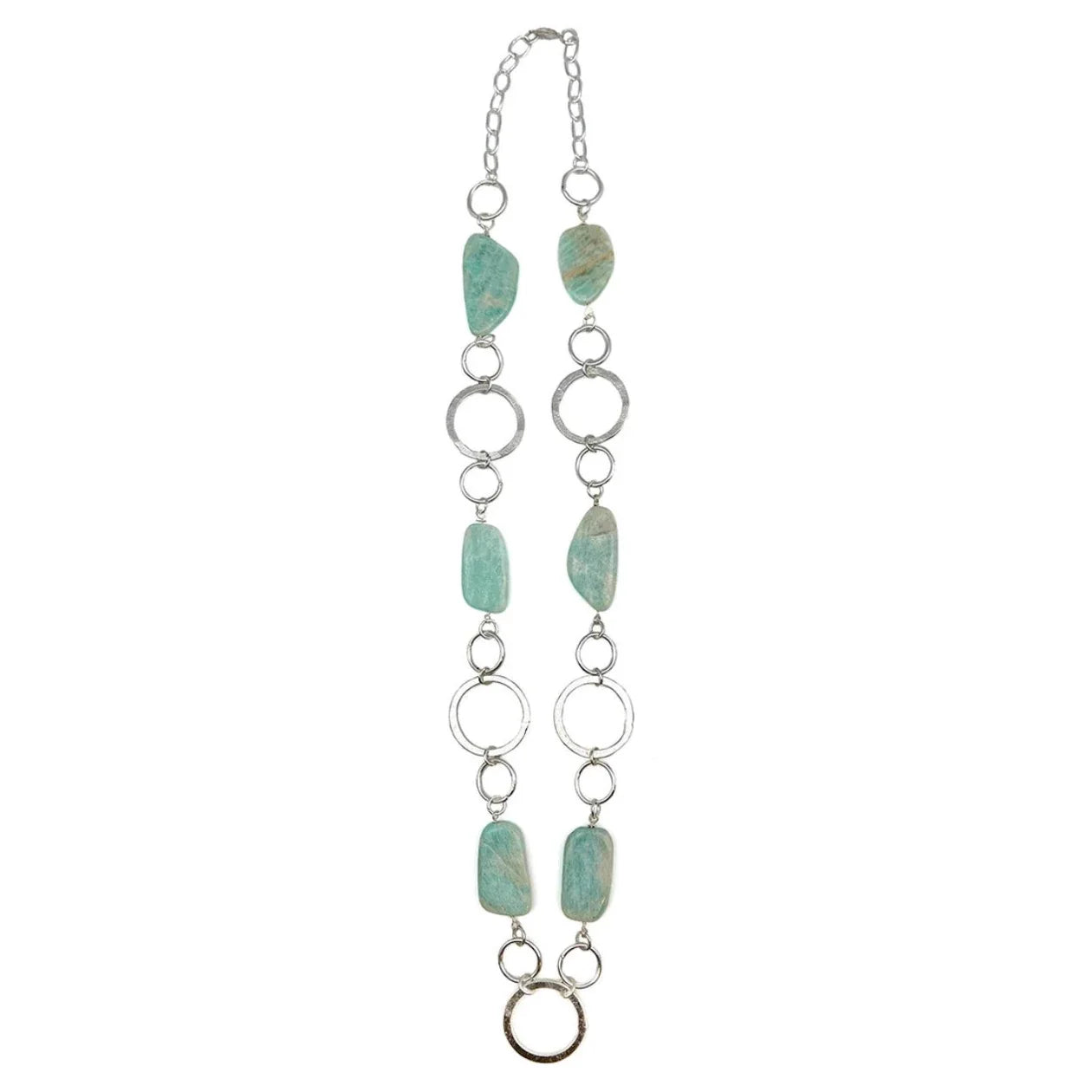 Handmade silver-plated brass necklace with semi-precious stones. Measures 30" long, handcrafted by artisans in India.