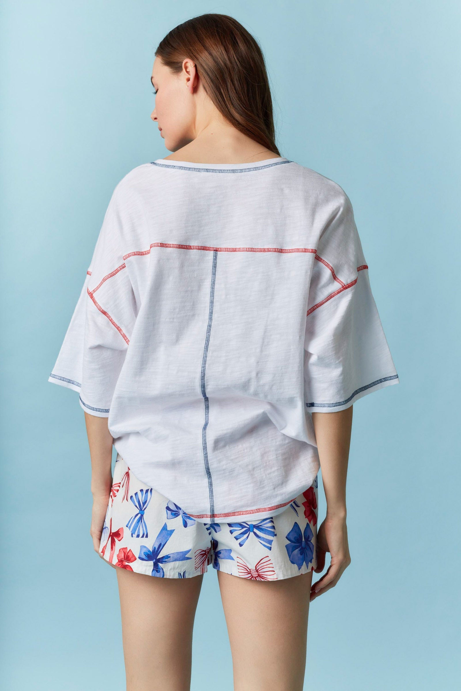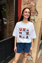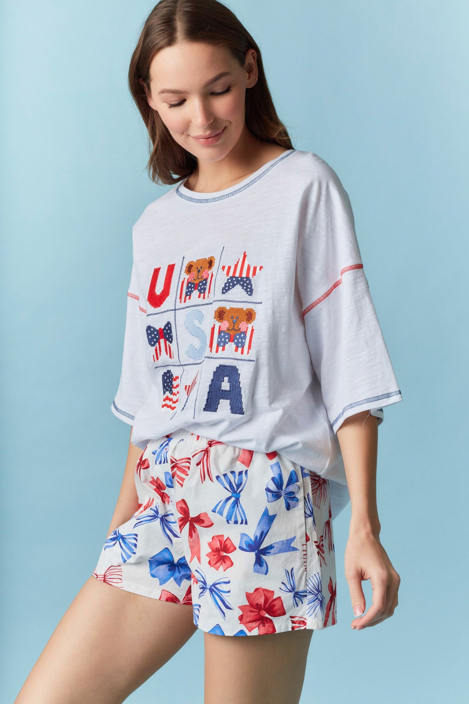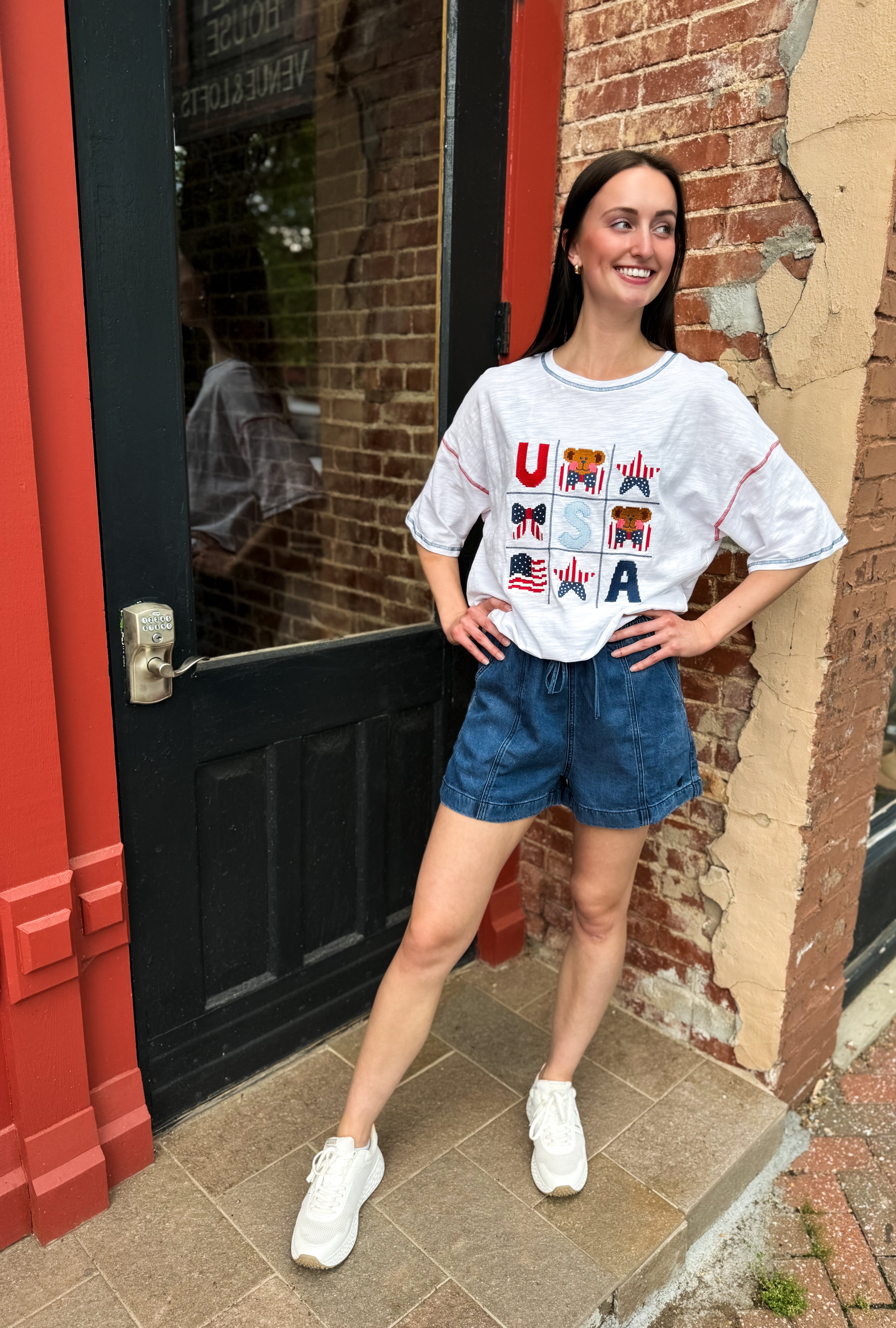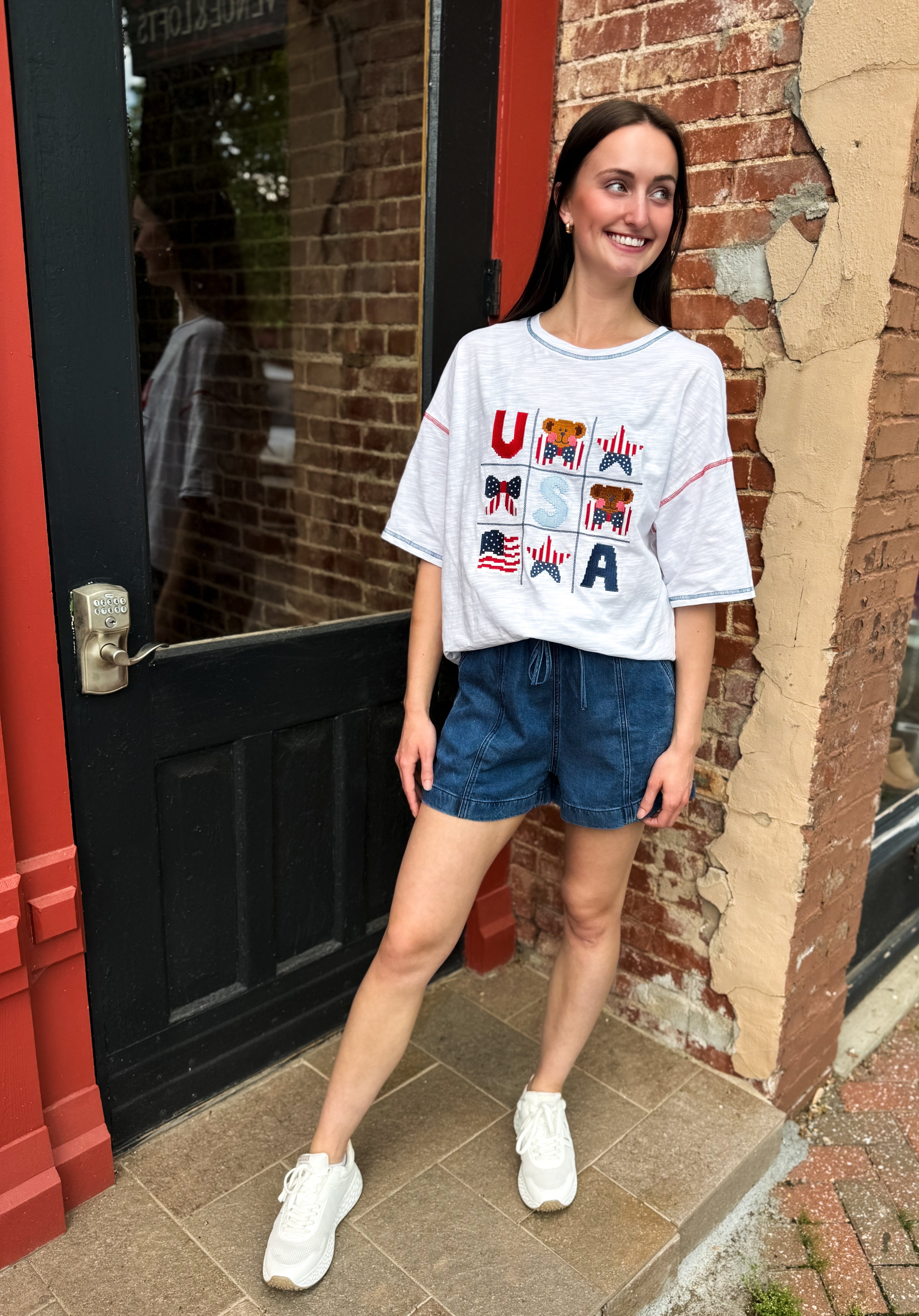 Show off your quirky style with our American Teddy Tee! Made from soft cotton jersey, this oversized tee features a playful bear embroidery and an American flag print. Perfect for a casual yet unique look.
