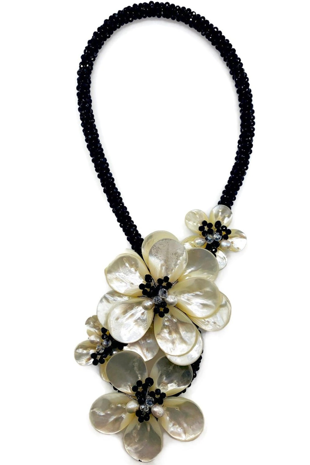 Handcrafted Necklace made with Black Swarosvki Crystals, Fresh Water Pearls and Mother of Pearl