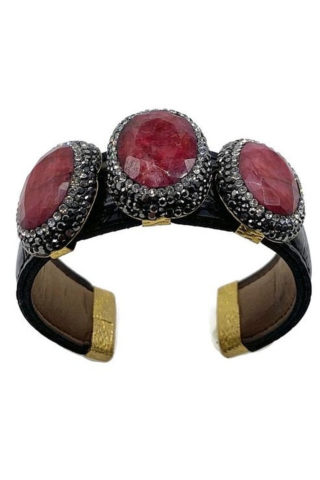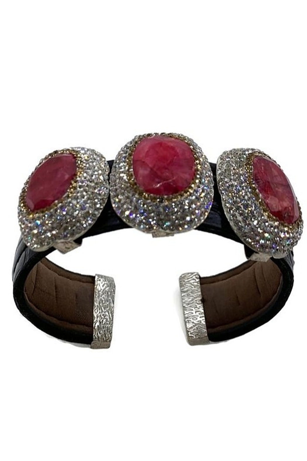 Leather Cuff Uncut Oval Ruby with Swarovski Crystals and