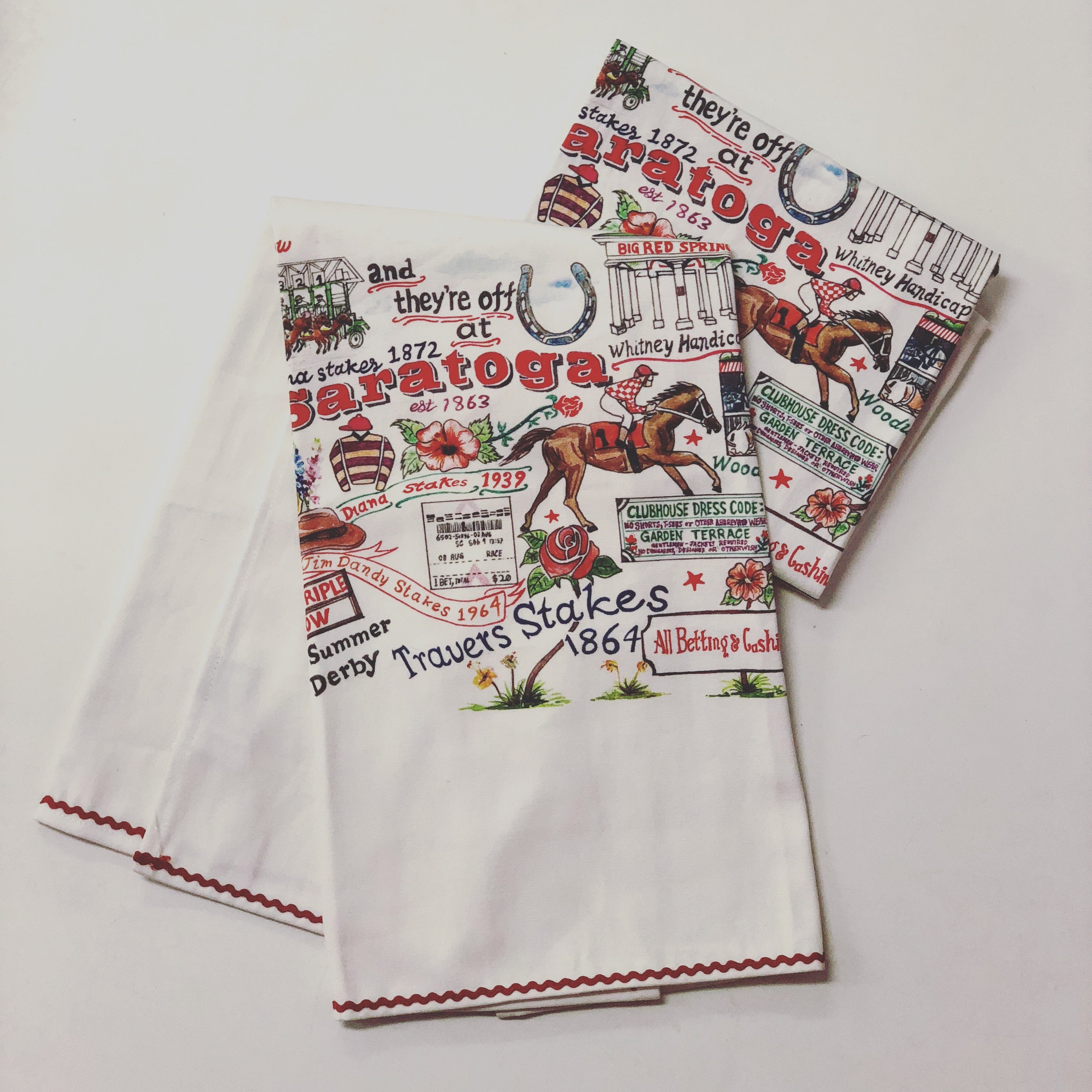 An exclusive Miss Scarlett Saratoga race course dish towel. Choice of Red Ric Rac trim.