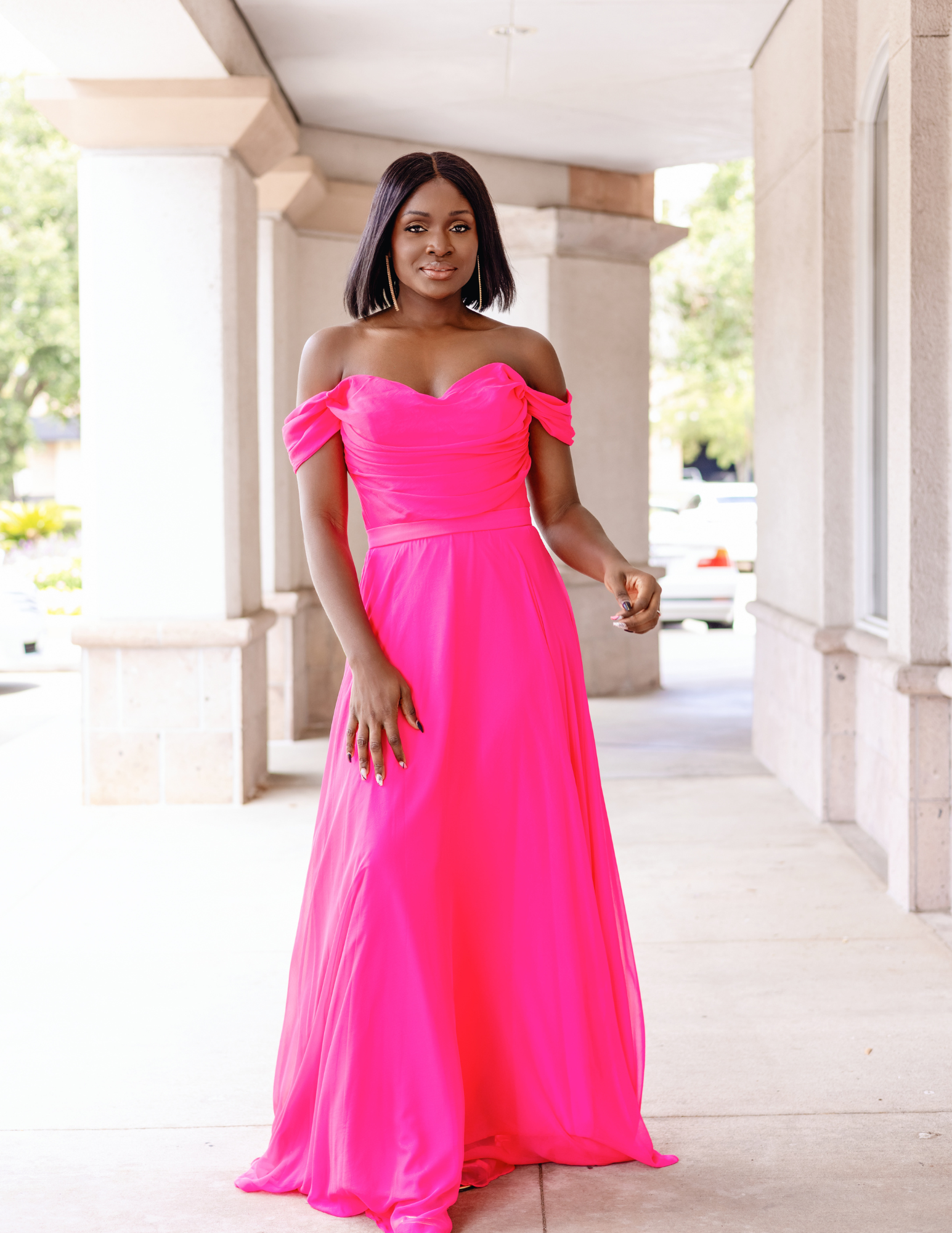 - The Angie Pink Dress is a perfect choice for any special occasion. It features layers of bright tulle with an elegant full-length design. An added chest padding provides comfort and support, while its flowy straps complete the look.