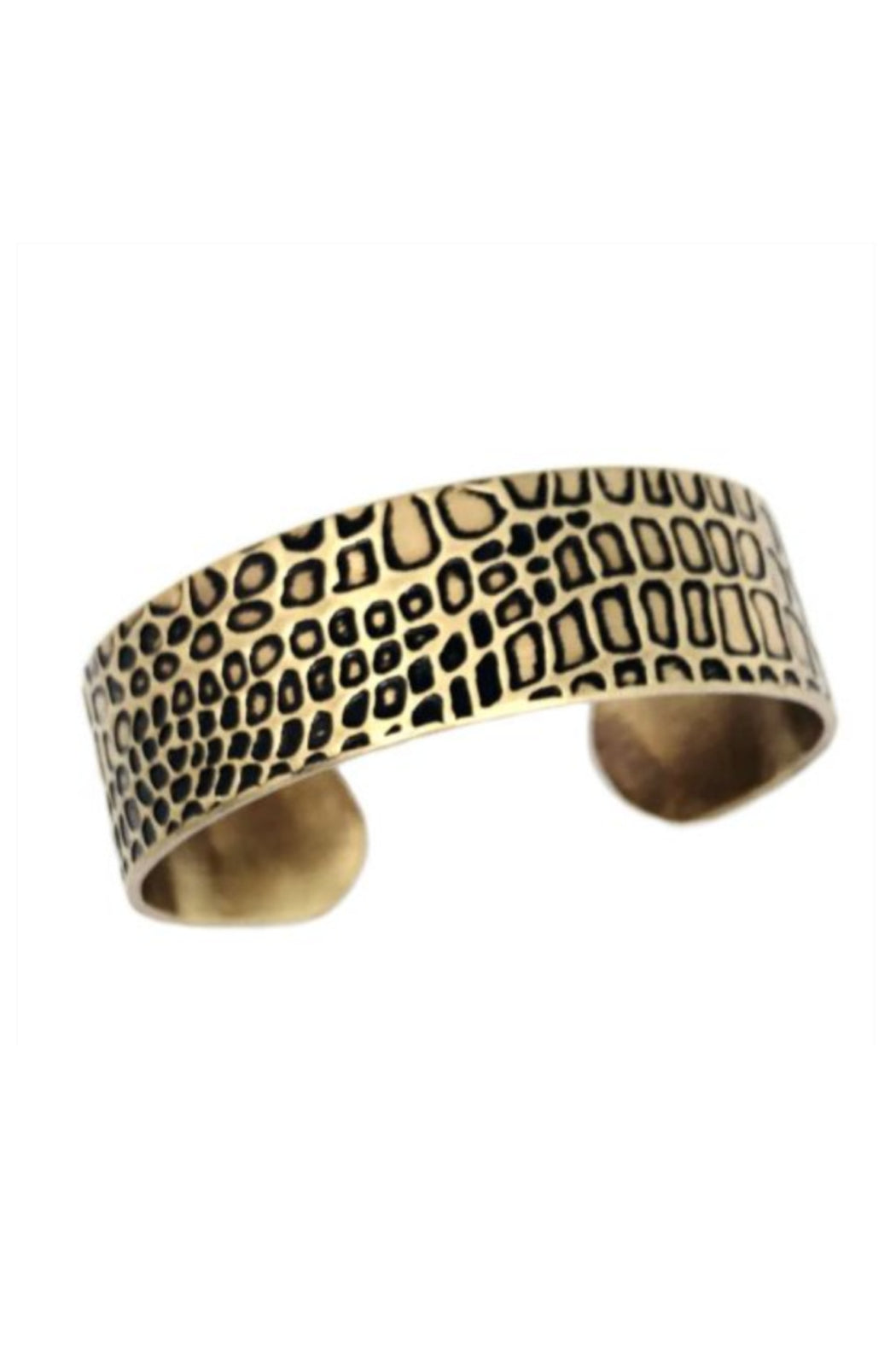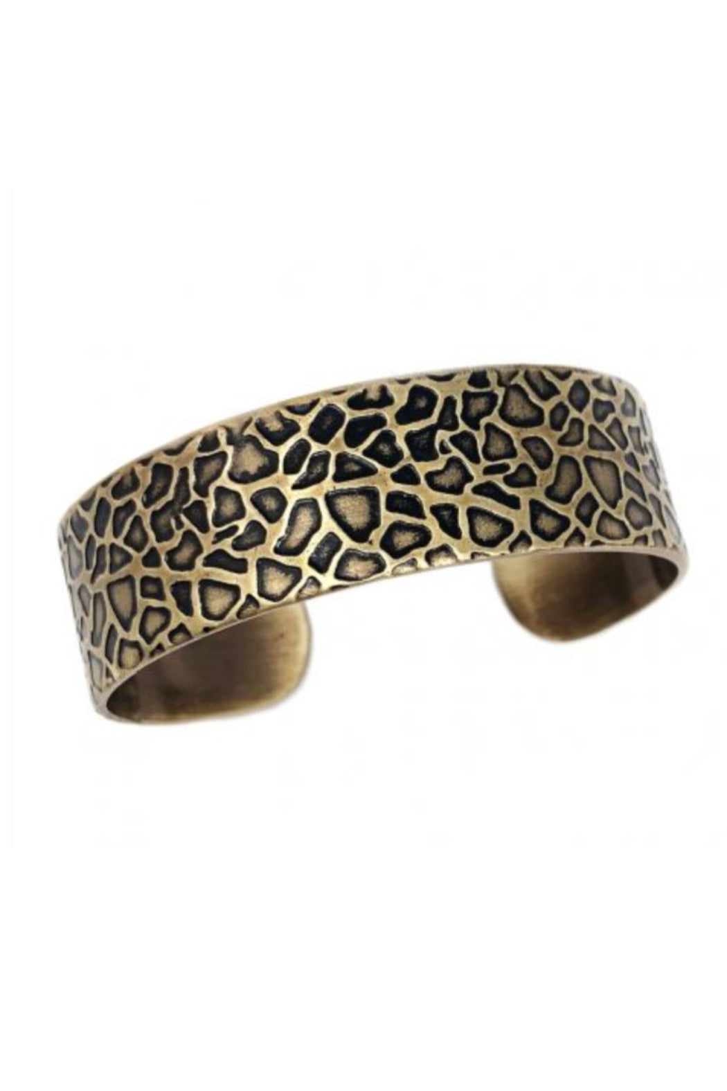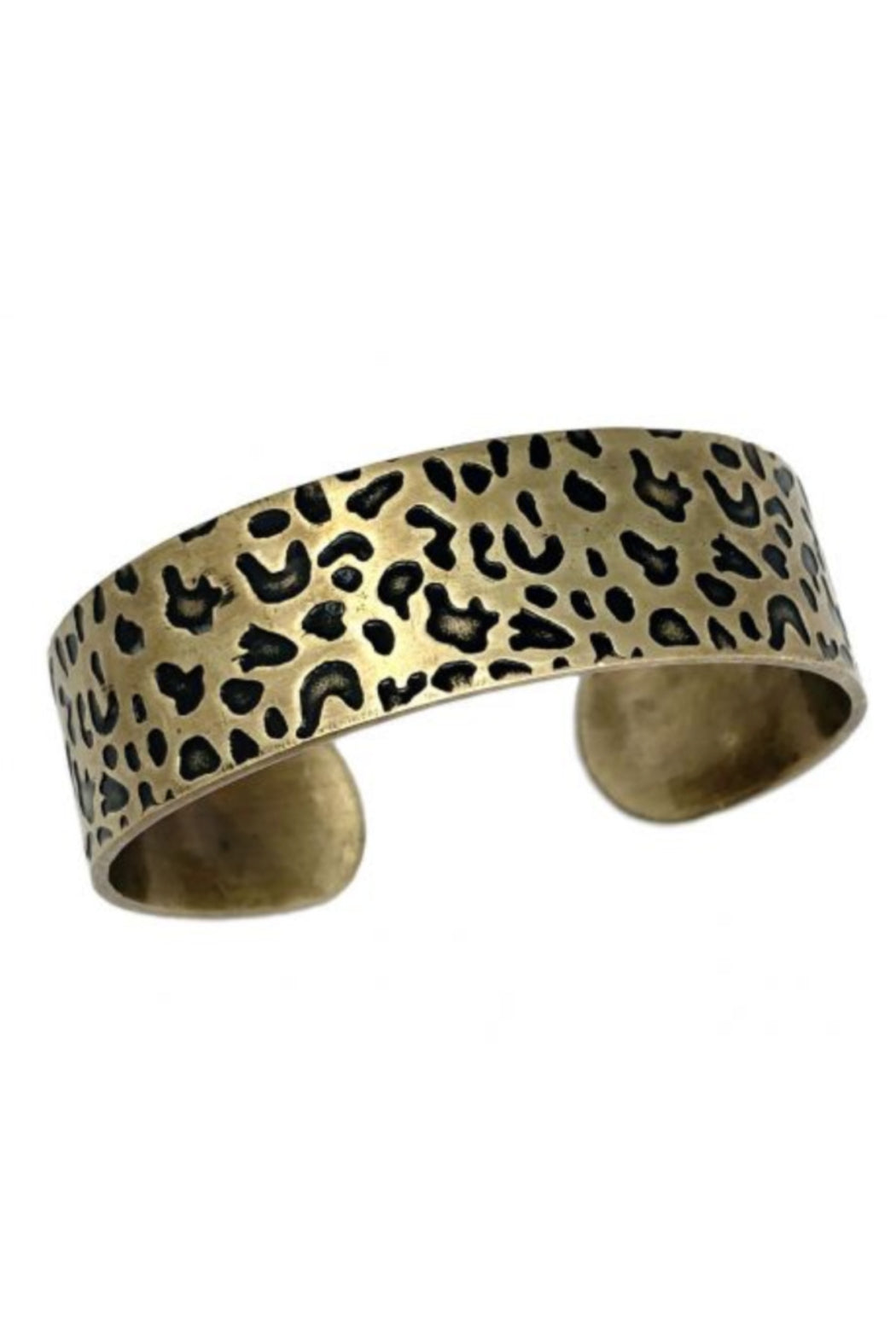 Take a walk on the wild side with Anju's brass cuff bracelet. Allover animal print. 0.75" wide, adjustable. Look for our matching earring!