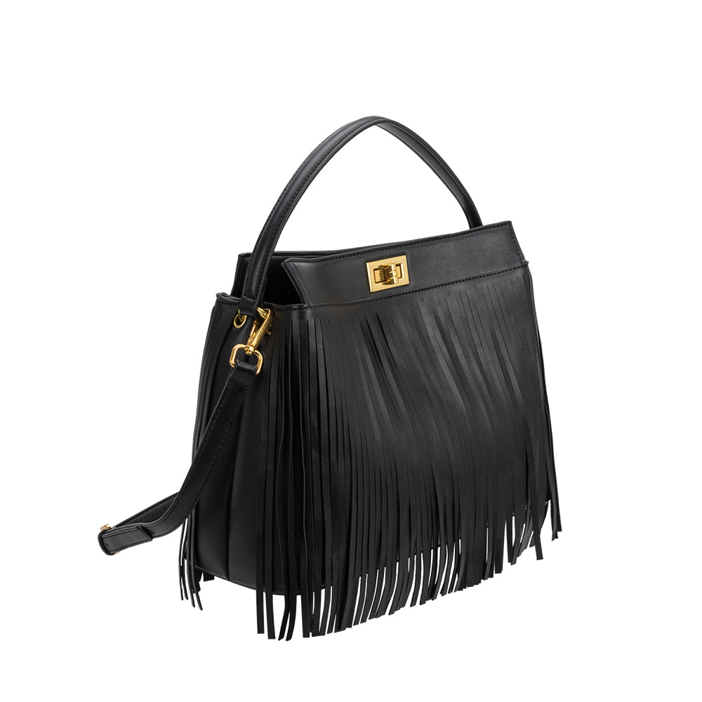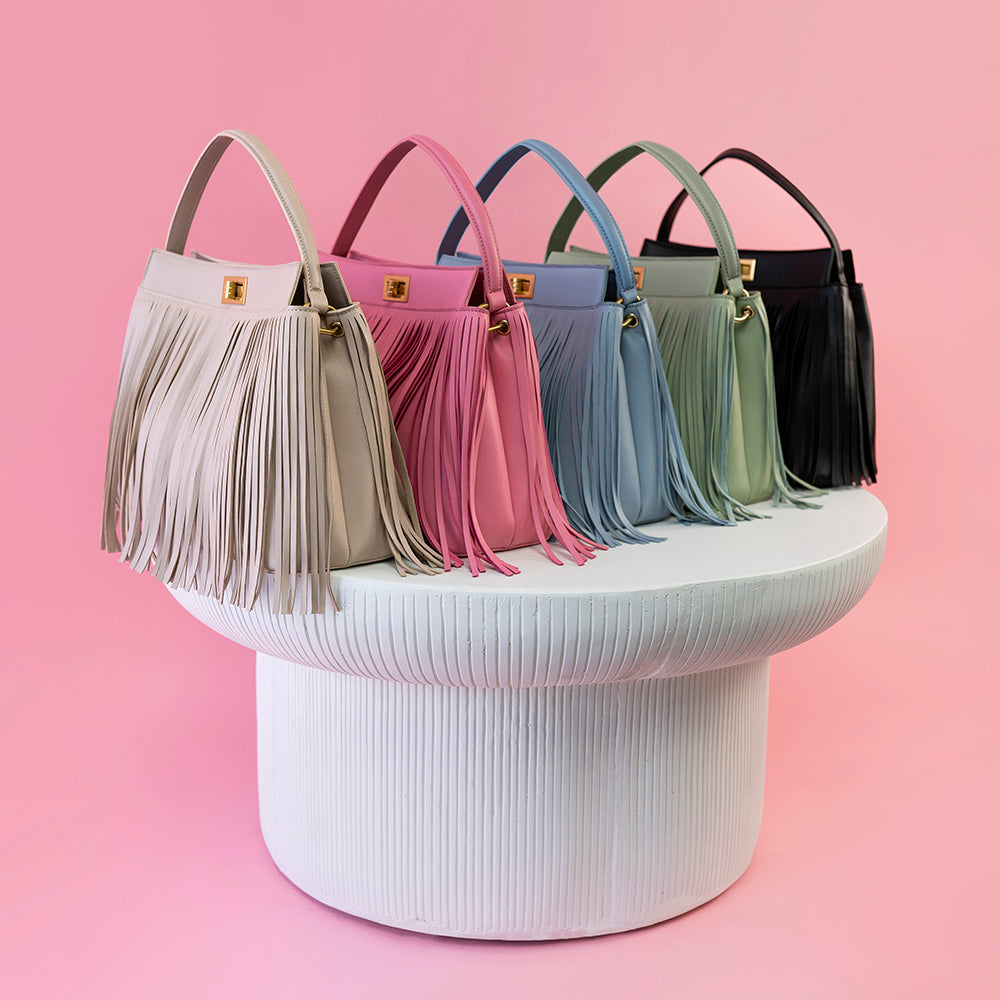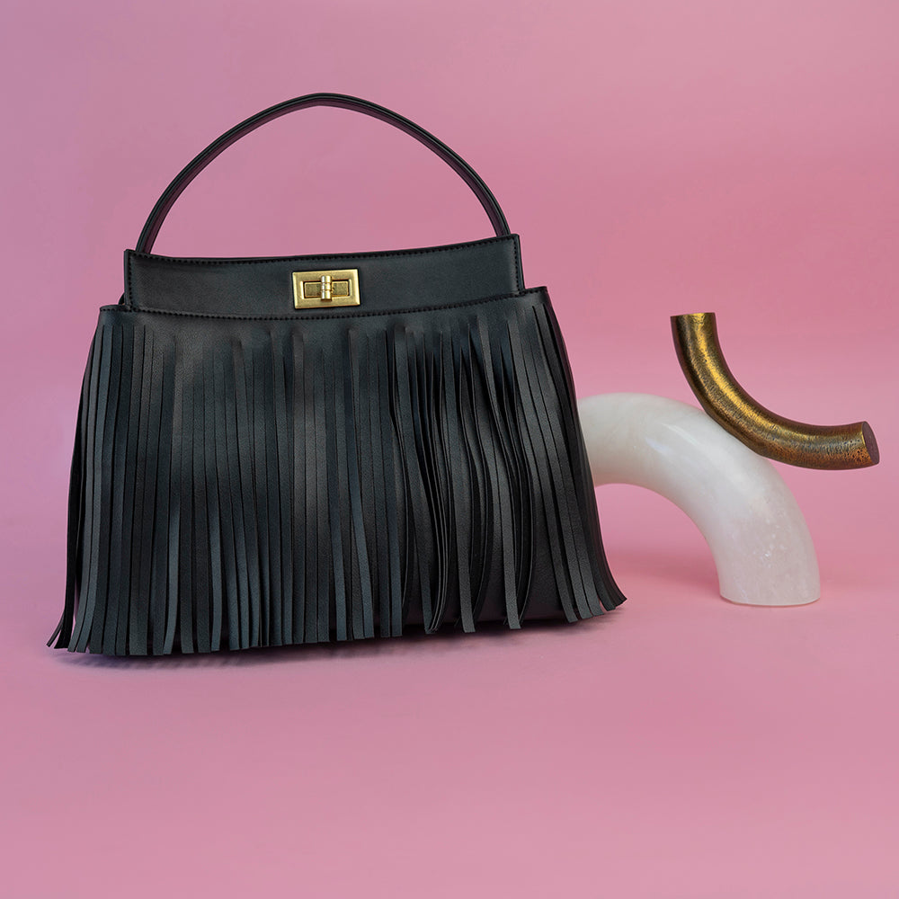 Anne is a structured top handle bag crafted from recycled vegan leather and lined with non-toxic cotton canvas lining. Beautifully designed with fringe details throughout, this handbag can also be used as a crossbody by attaching the adjustable crossbody strap.