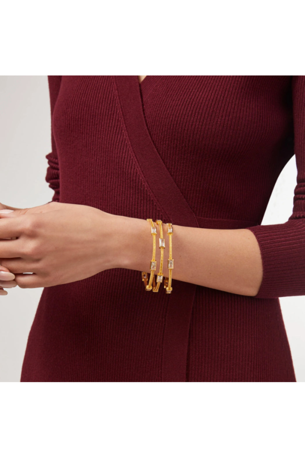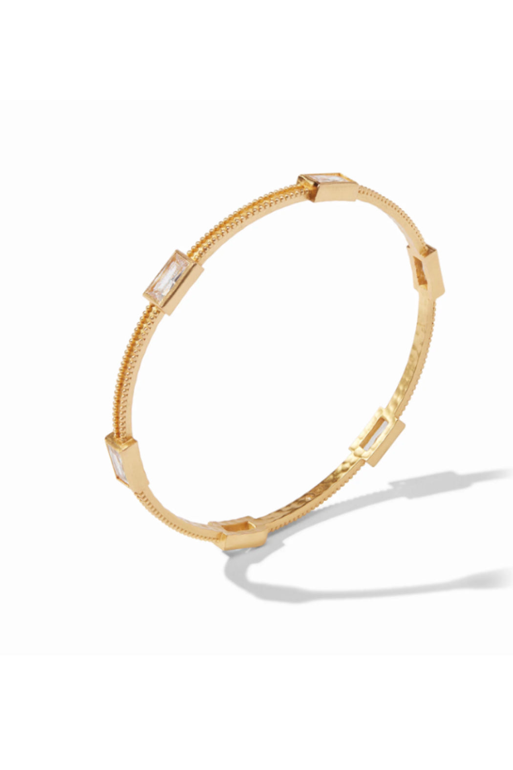Six baguette stones stud the length of this slim, textured bangle, lending it a crown-like appearance that's stunning on its own, as well as doubled, tripped, or stacked alongside your own favorite bracelets and cuffs.