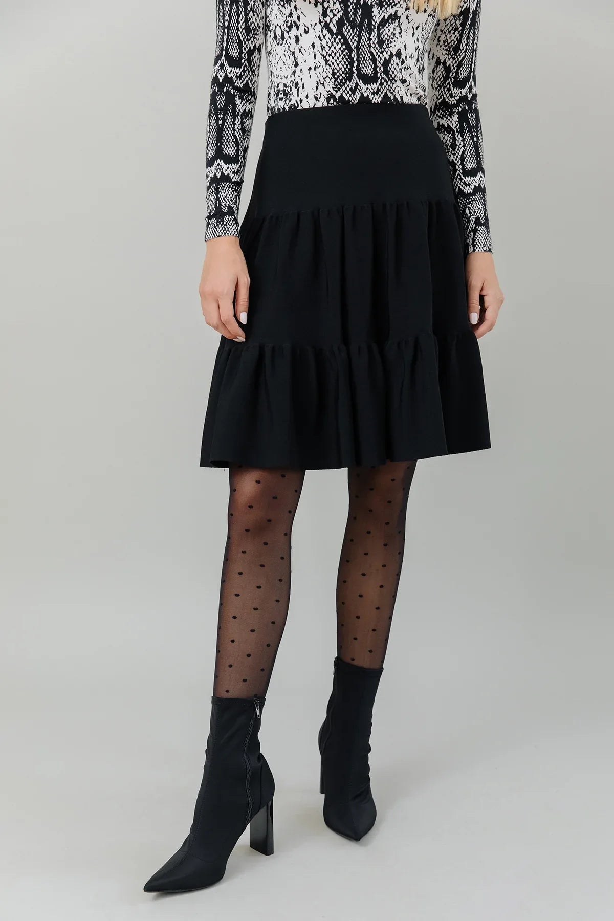 •LOOK: This midi heavy knit tiered skirt is so versatile, it takes on a different look depending on the top you pair it with. Wear it to work with a favorite sweater, or try a blouse for a fancier occasion. The flirty ruffle provides graceful movement when walking or dancing. There is a matching jacket available for yet another spectacular look. Don’t be afraid to accessorize with jewelry, scarves, funky tights and shoes. This black tiered ruffle skirt can be classic or trendy depending on your mood and imagination.