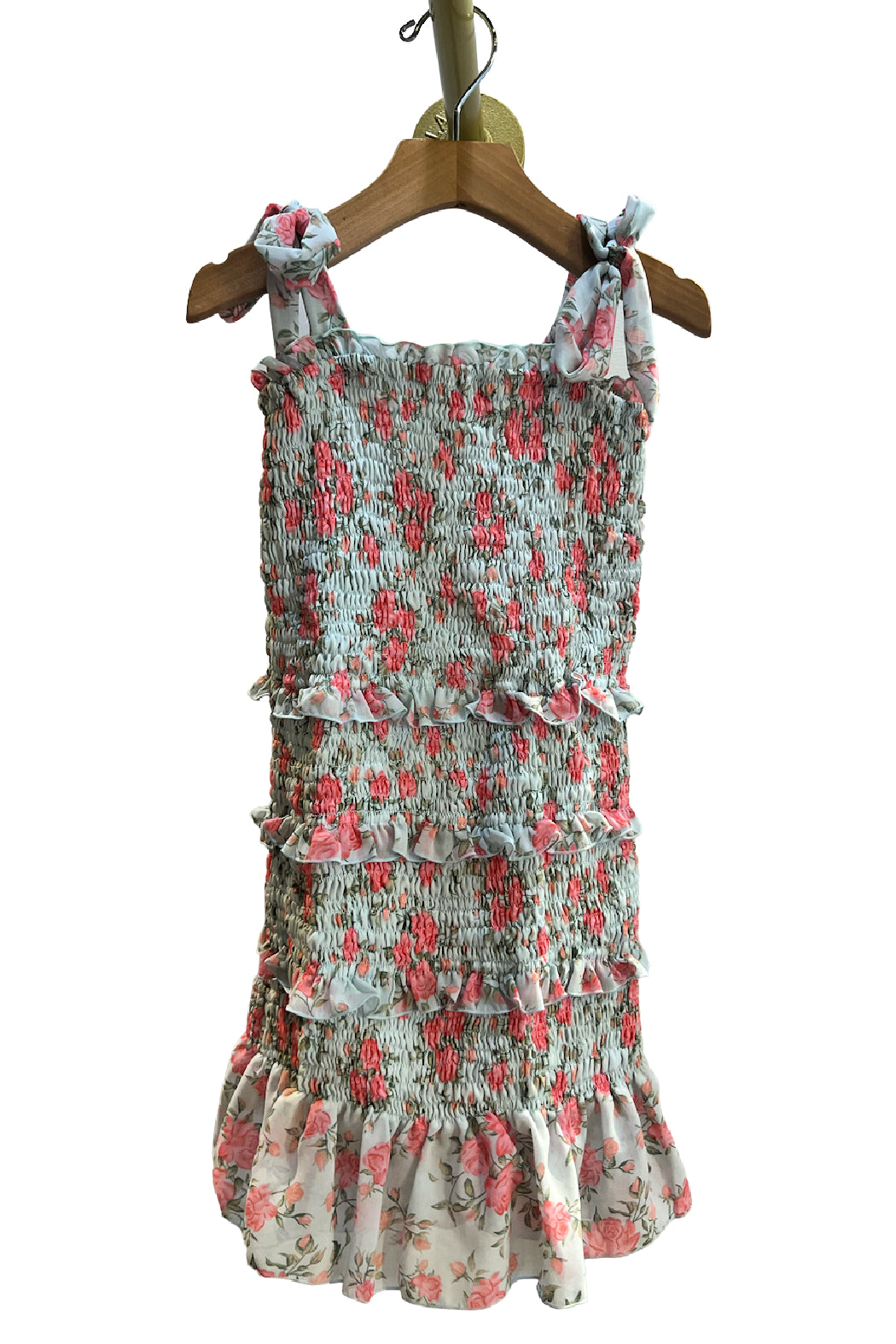 Tiered, smocked, printed chiffon dress.