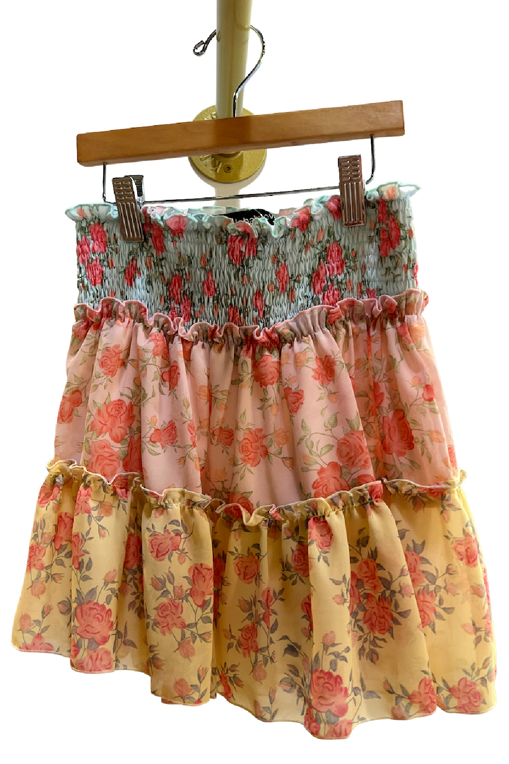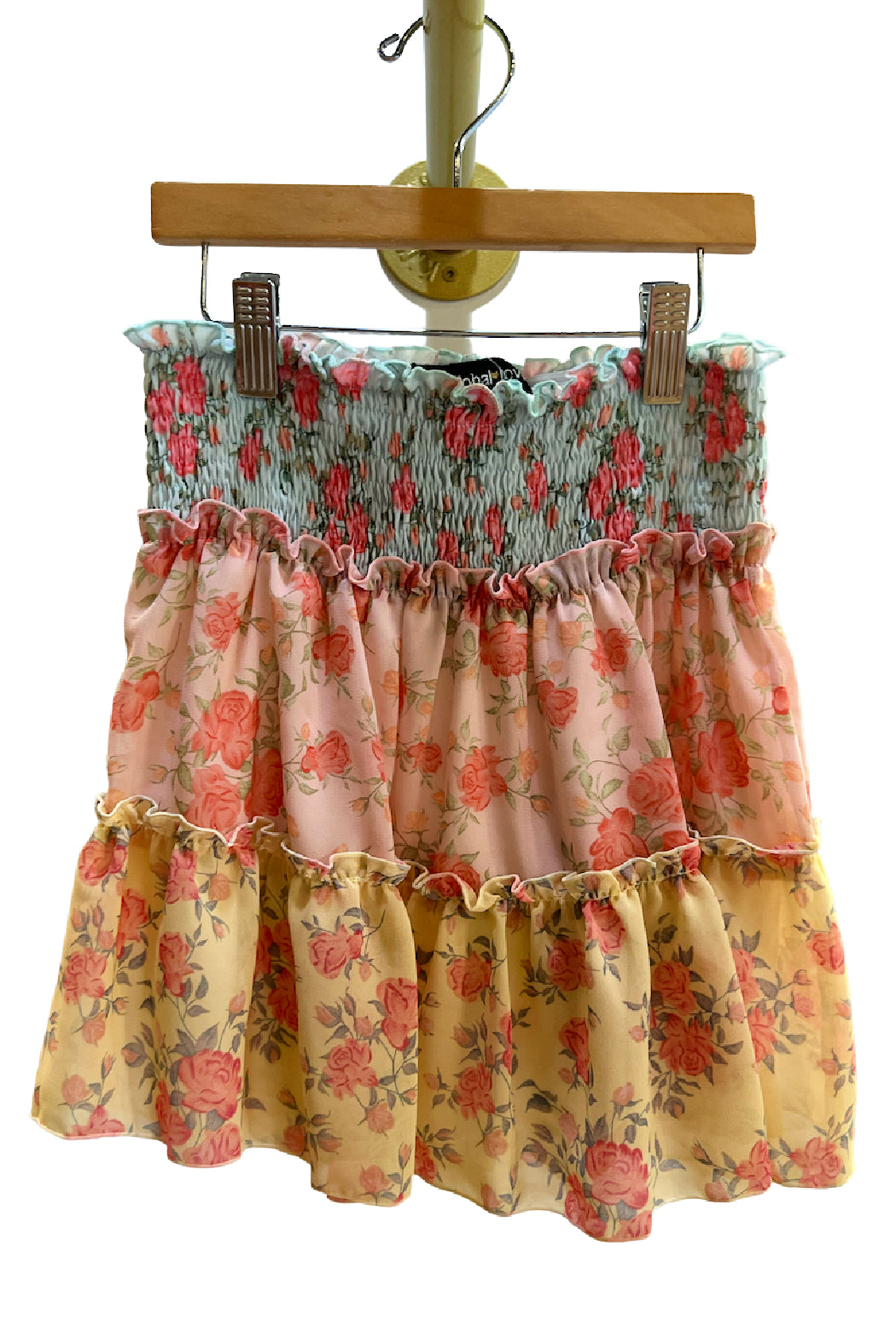 Chiffon, multi-tiered skirt.