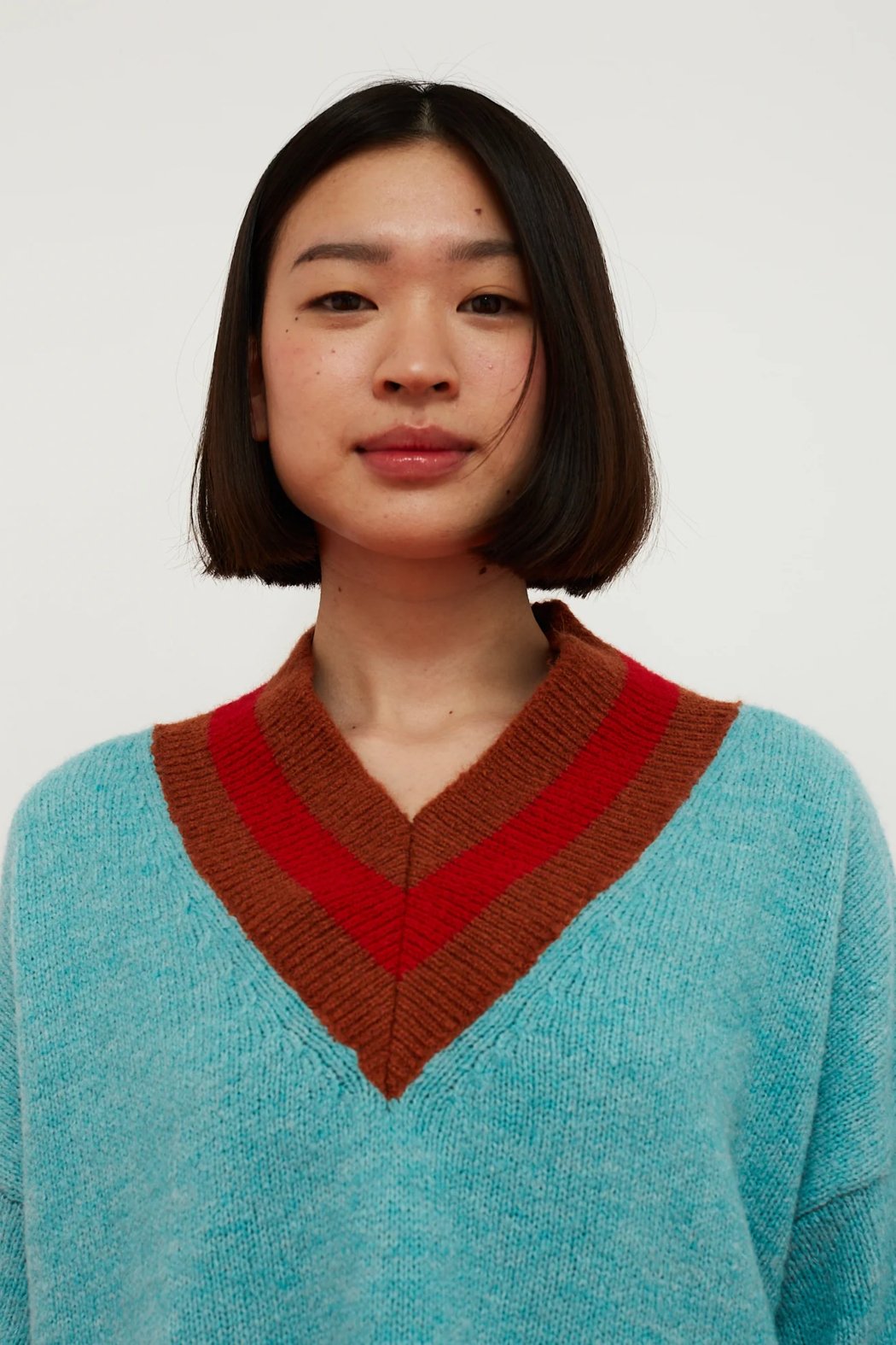 Aqua-colored sweater, with a loose fit and oversized design. V-neck finished with a tricolor ribbed trim in red and brown, providing a striking contrast. Made from soft, pleasant-to-the-touch knit fabric. Features side slits at the hem for greater movement and comfort, with the back slightly longer than the front. Red finish on the cuffs and hem adds a modern and casual touch.