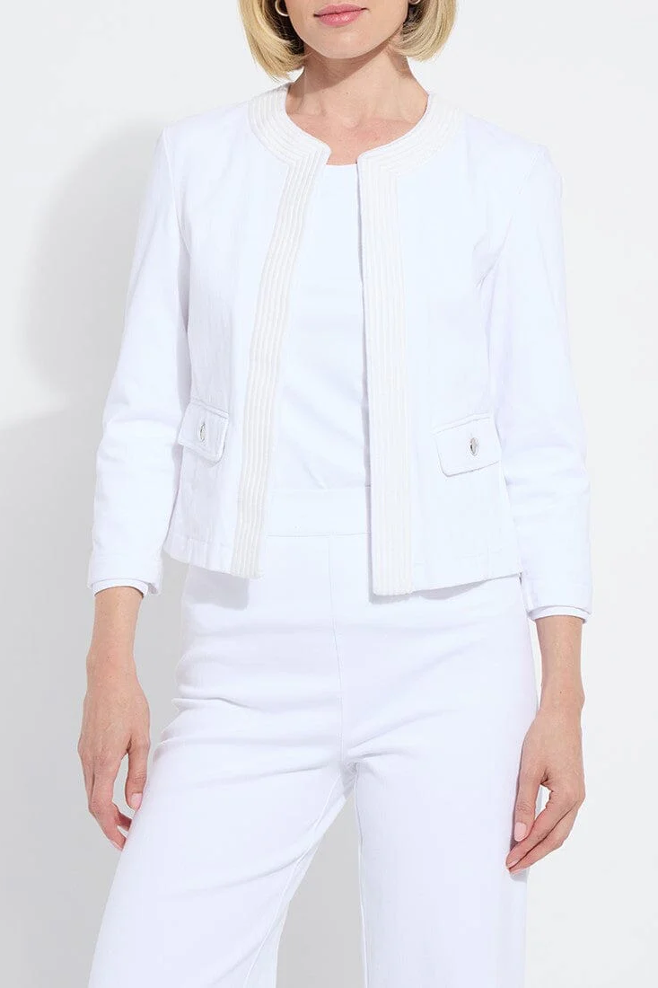 The Arbor Embroidered Denim Jacket, made from 4-way stretch Knit Denim, is a collarless, cropped blazer with bracelet sleeves, a front welt pocket, High-Shine Silver Metal buttons and heavy placed embroidery on the front collar and center front. The Arbor Embroidered Denim Jacket is half-lined on the front with binding throughout. For a chic, white-on-white look