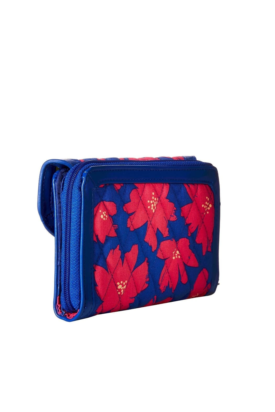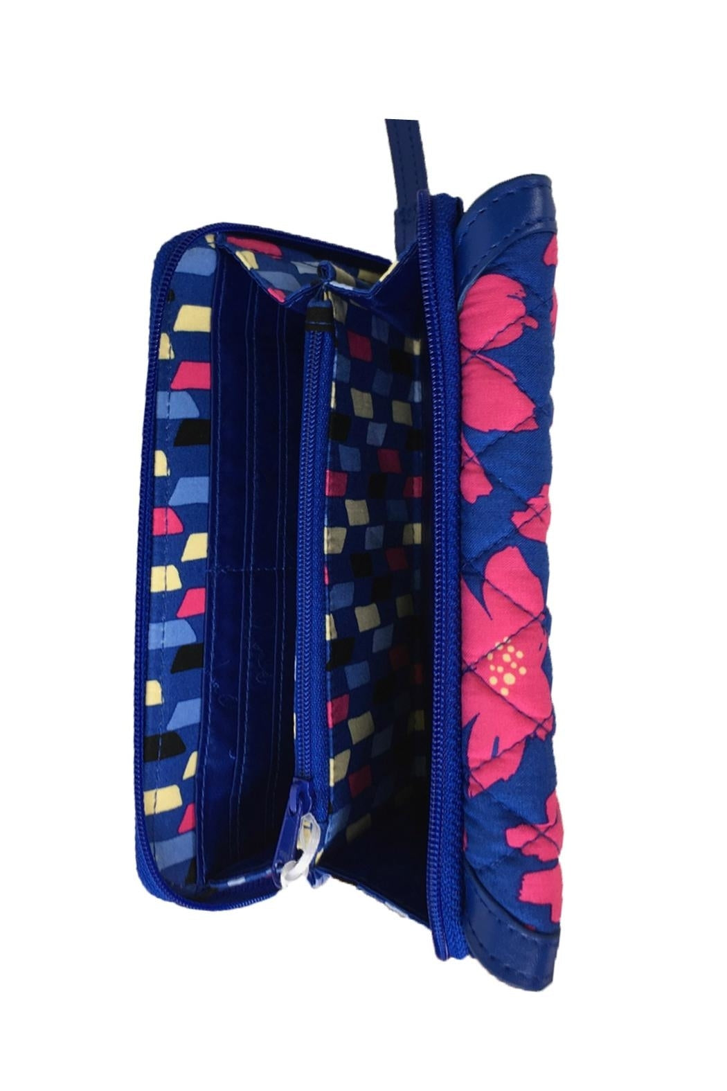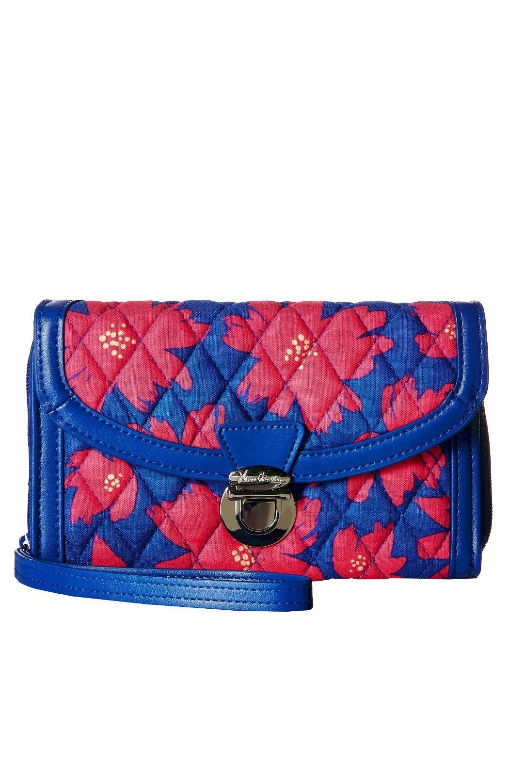 Meet the Vera Bradley Ultimate Wristlet in the Art Poppies pattern. The items made in this pattern are a part of Vera Bradley's "Pink With A Purpose" campaign for the Vera Bradley Foundation for Breast Cancer. There is room for everything in this wristlet; your credit cards, cash, ID, coins, gift cards AND phone up to 6.5". We think this is the BEST wristlet Vera Bradley has made, and we know you're going to love it! The front push lock-closure compartment has 10 card slips, two ID windows, and a bill pocket. Zip compartment has a coin pocket, divided interior with one bill pocket, two pleated compartments, and six card slips. Silver tone hardware. Pattern placement will vary. Click on "Mimi's Gift Gallery" on this page to find other bags and accessories in the Art Poppies pattern. Dimensions are 7 ¼" wide x 4 ¾" high x 1 ½" deep with a 6" vegan leather wrist strap.