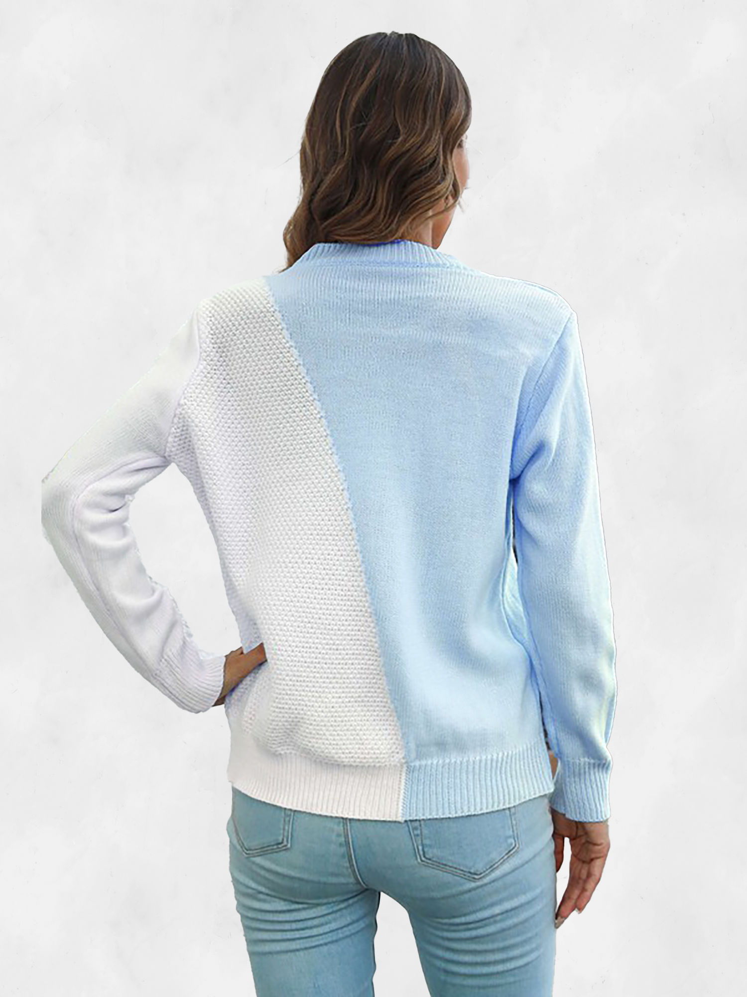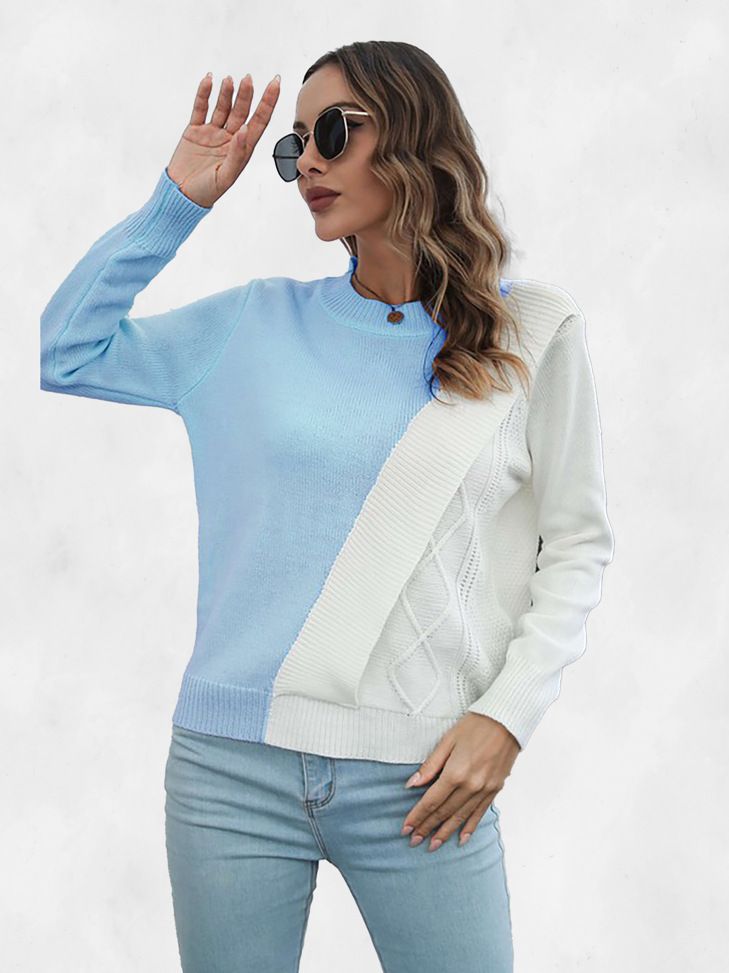 Description - Cozy up in chic style with the Asia Direct+ Baby Blue Diagonal Color Block Knit Sweater. This trendy sweater features a playful diagonal color block design in a soft baby blue hue, perfect for adding a touch of personality to your outfit. The relaxed fit flatters all body types, while the knit fabric ensures warmth and comfort.