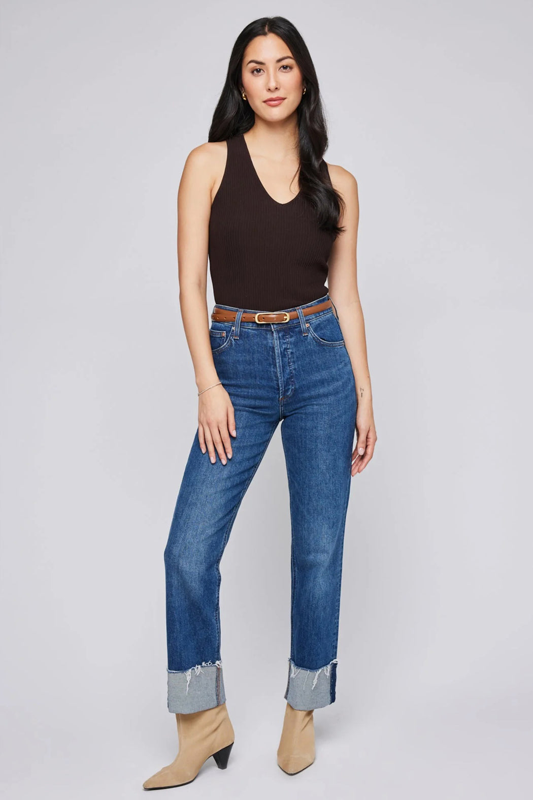The Astor tank is a thick close knit v-neck ribbed tank with thick straps and a subtle racerback. Pair with your favorite denim for a timeless look.