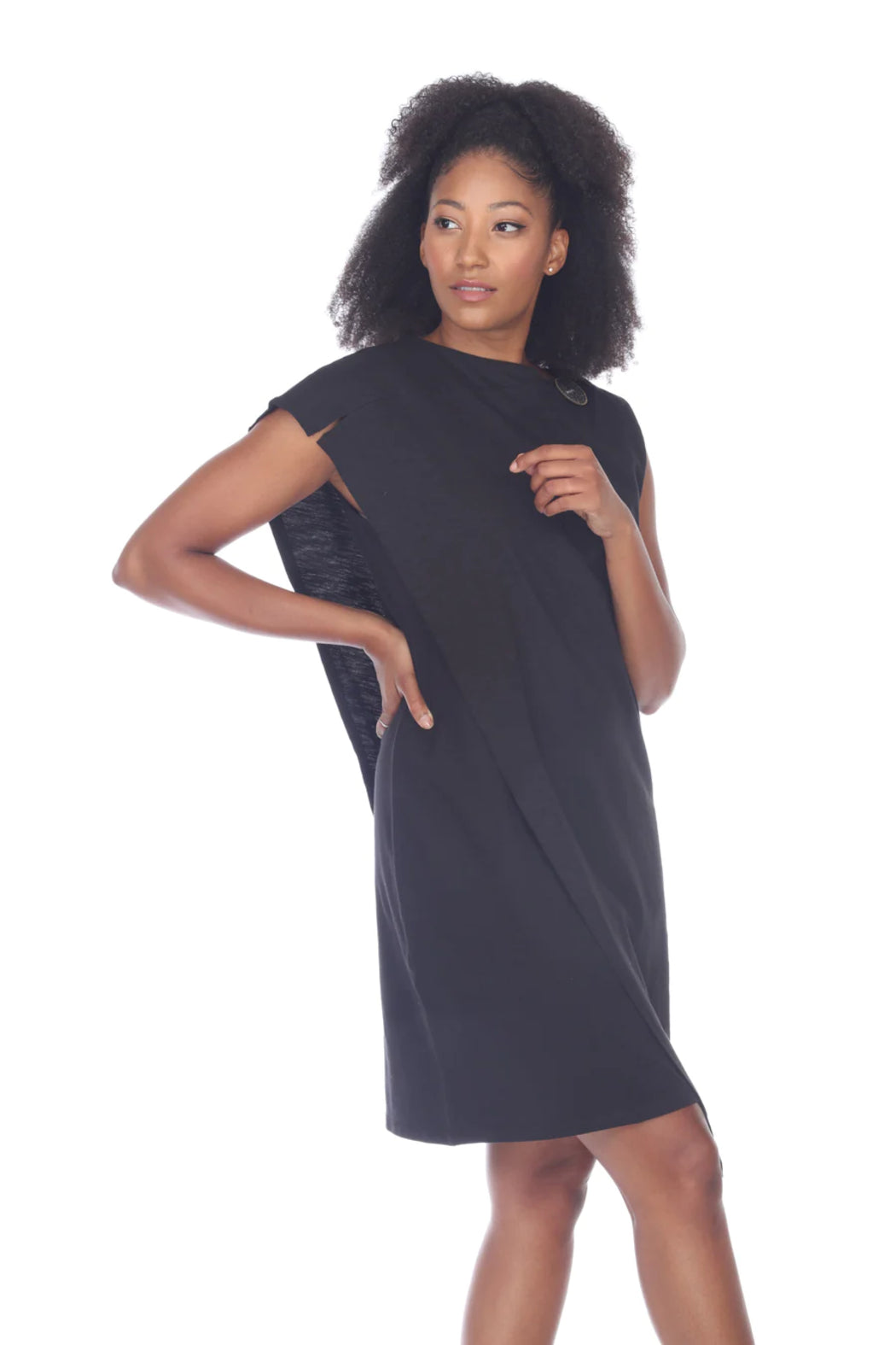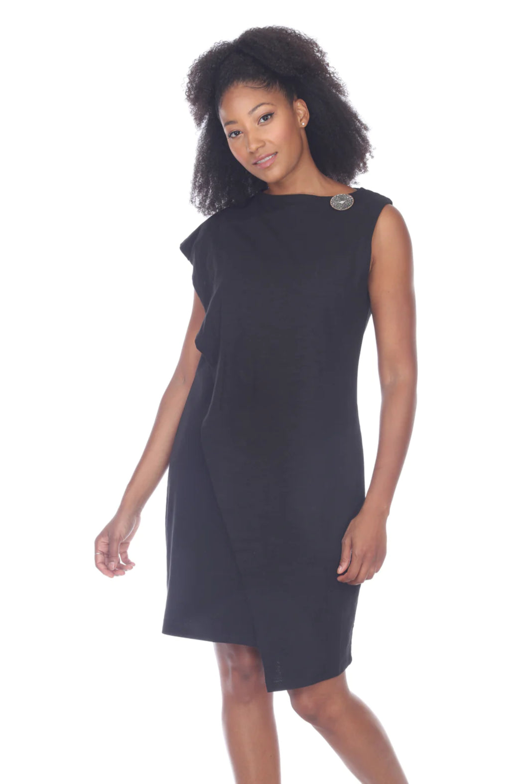 The little black dress: always chic, always ready to party. Slip on this stretch-jersey On Deck Dress and say yes to all those summer events. The draped panels add interest and keep the stretchy, fitted midi silhouette feeling easy and breezy. One cool ornate button adorns the left shoulder for a fun added detail.