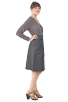 A work horse of a high waisted skirt. Paneled skirt with giant structured pockets for all your essentials. Who needs to be bogged down by a bag or purse?! American made nylon zipper with brass button rivet closure. Our favorite above the knee length, where it is still safe to ride a bike and bend over with ease.