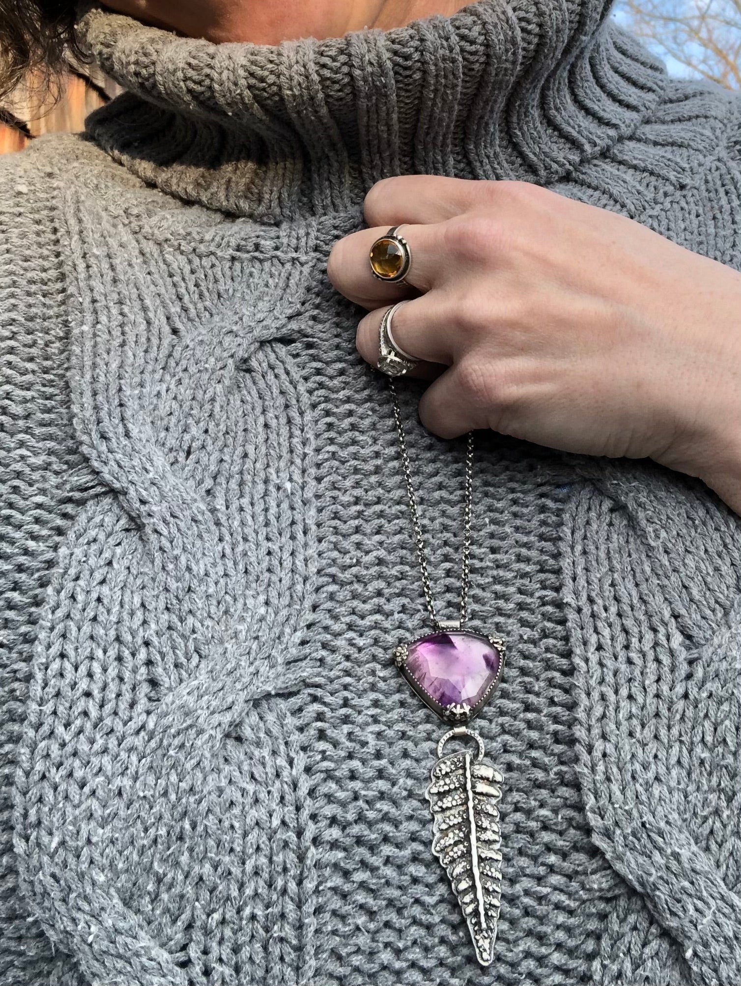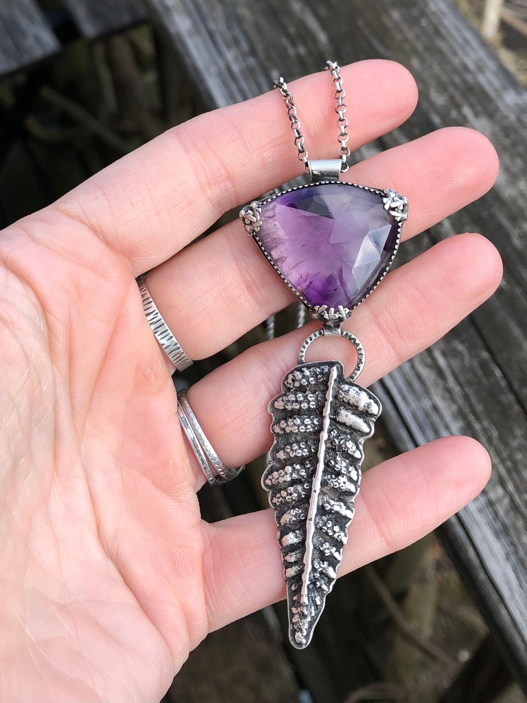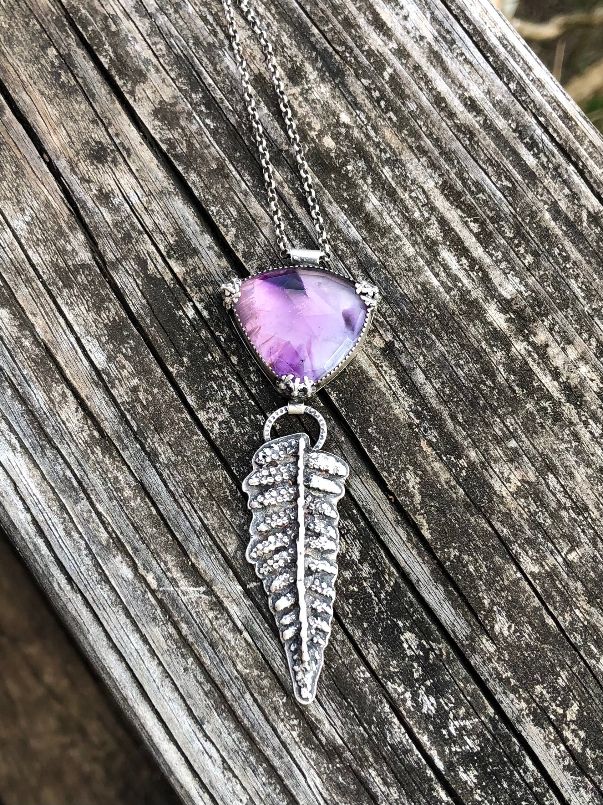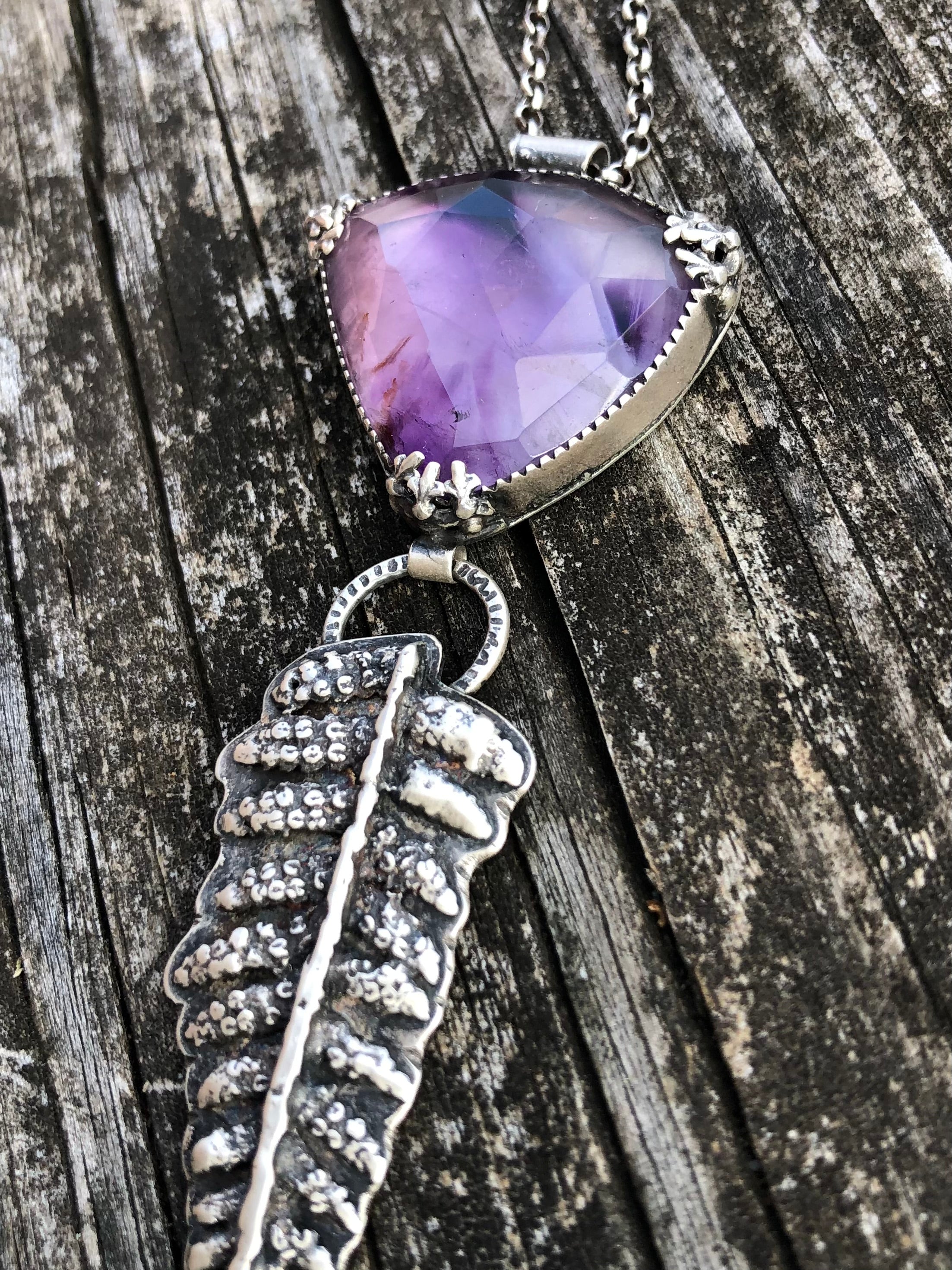 A beautiful faceted triangle of atomic amethyst with super fun dark purple triangular inclusions is set in fine and sterling silver with a serrated bezel. Each corner is adorned with 3 fancy prong accents. An incredible casting of a real fern dangles kinetically from the bottom of the amethyst. Finished on a silver silver rollo chain with a large lobster clasp. 17 inches in length.