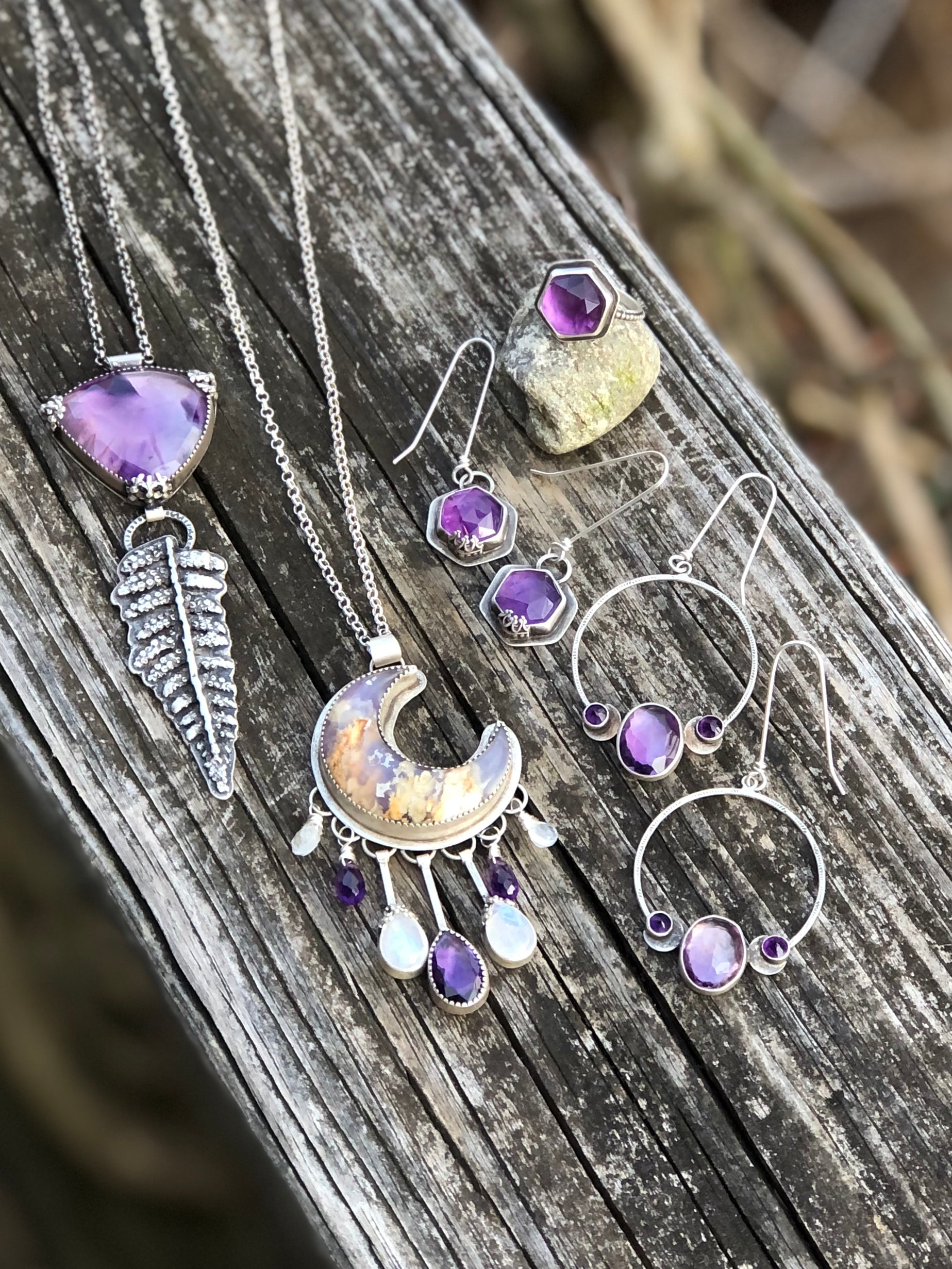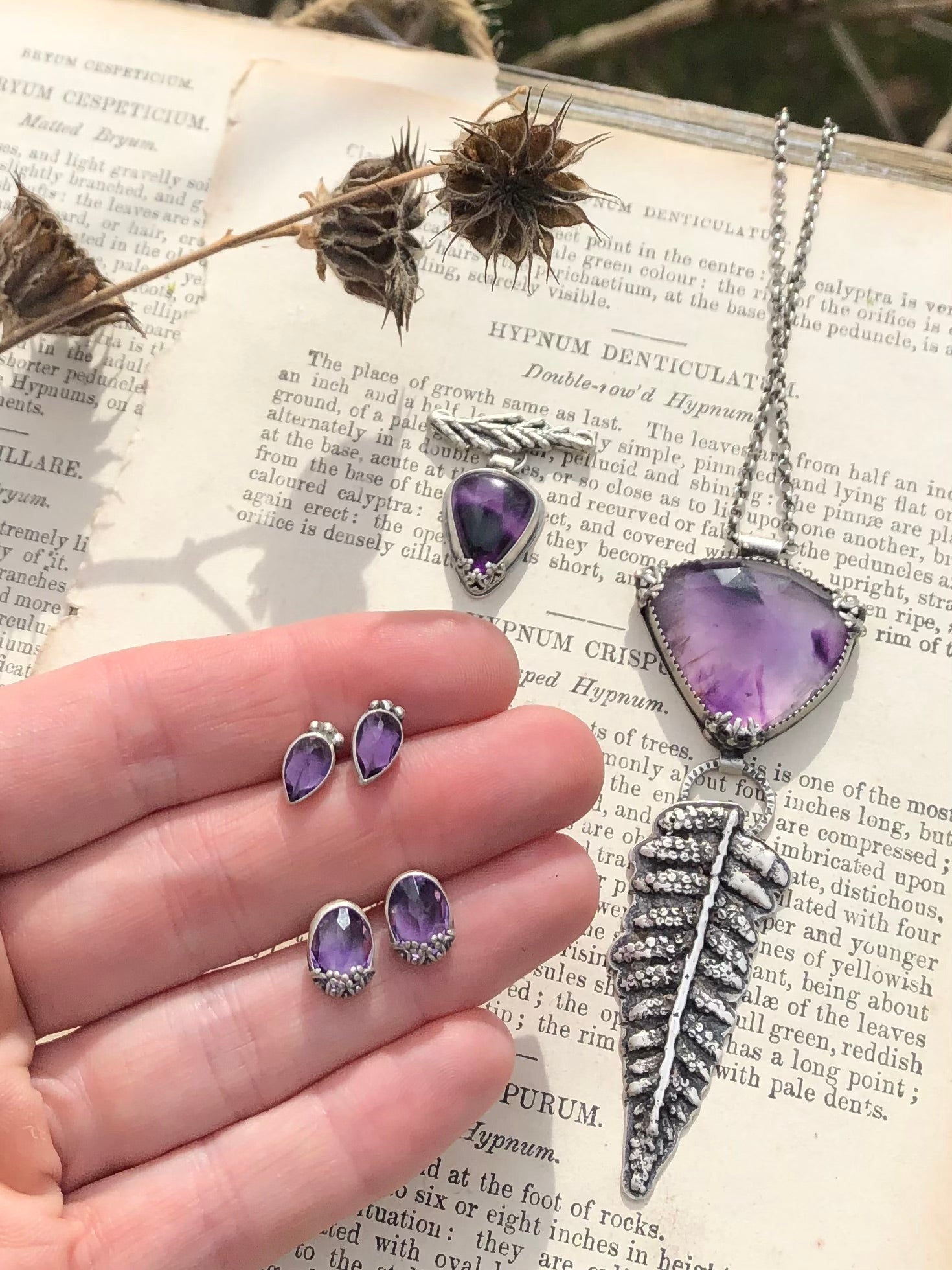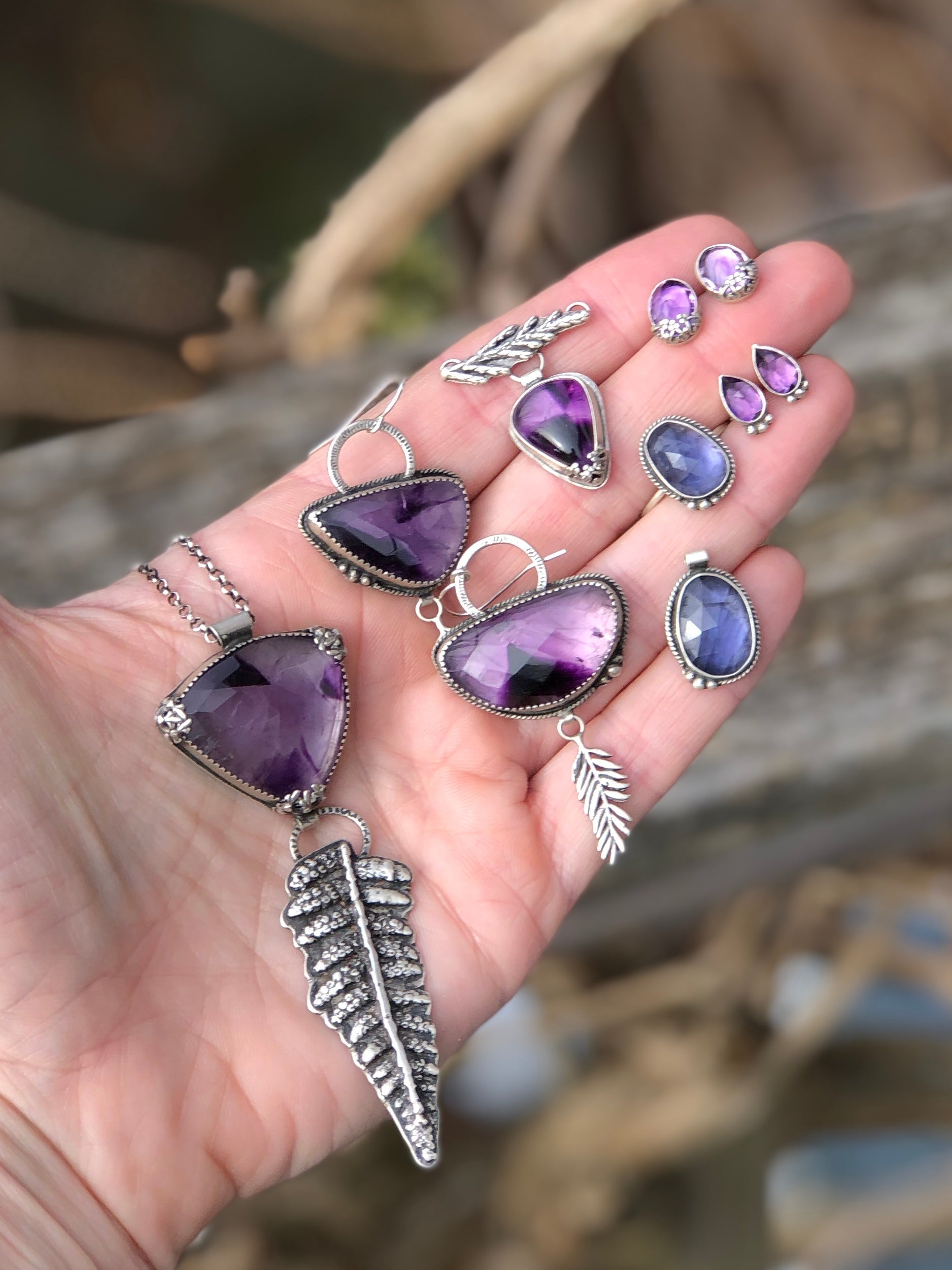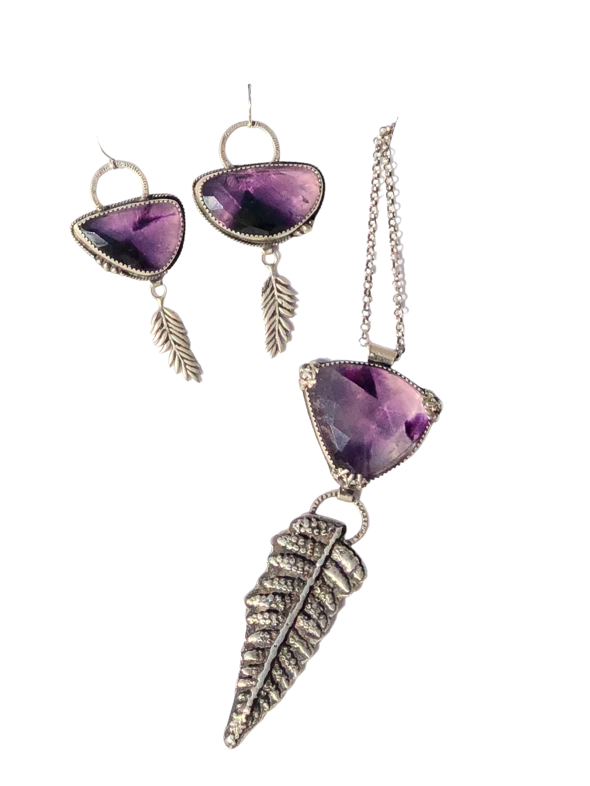 A beautiful faceted triangle of atomic amethyst with super fun dark purple triangular inclusions is set in fine and sterling silver with a serrated bezel. Each corner is adorned with 3 fancy prong accents. An incredible casting of a real fern dangles kinetically from the bottom of the amethyst. Finished on a silver silver rollo chain with a large lobster clasp. 17 inches in length.