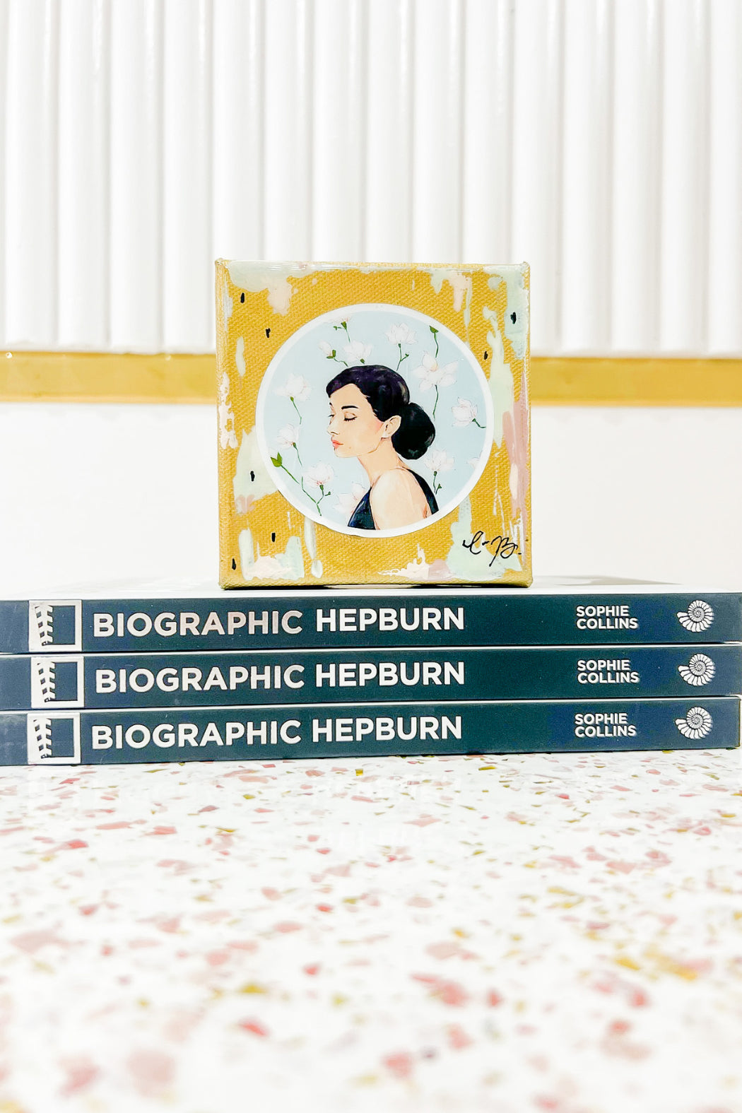 This 4 inches x 4 inches mini canvas shows Audrey on her iconic Tiffany Blue background with white magnolias.